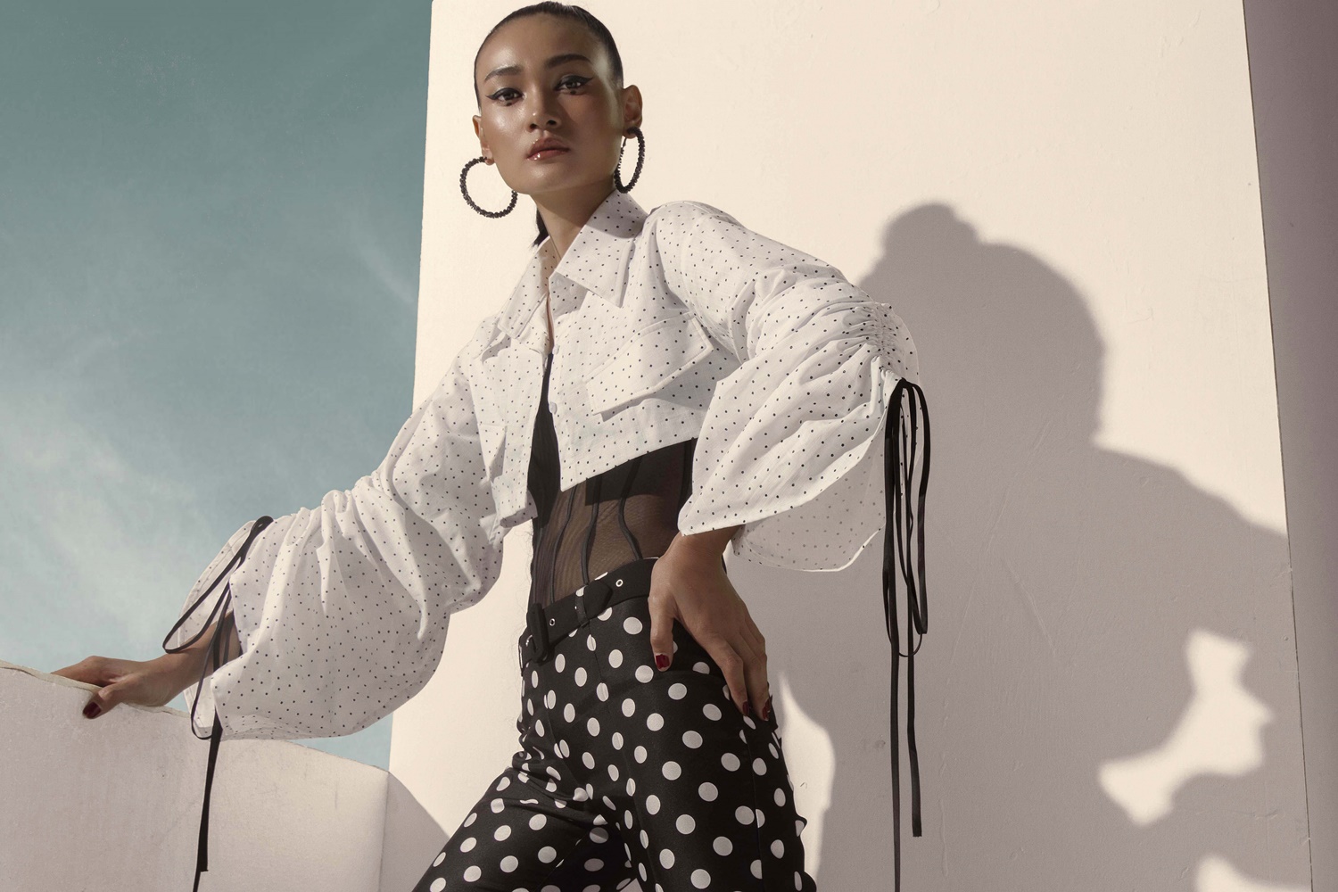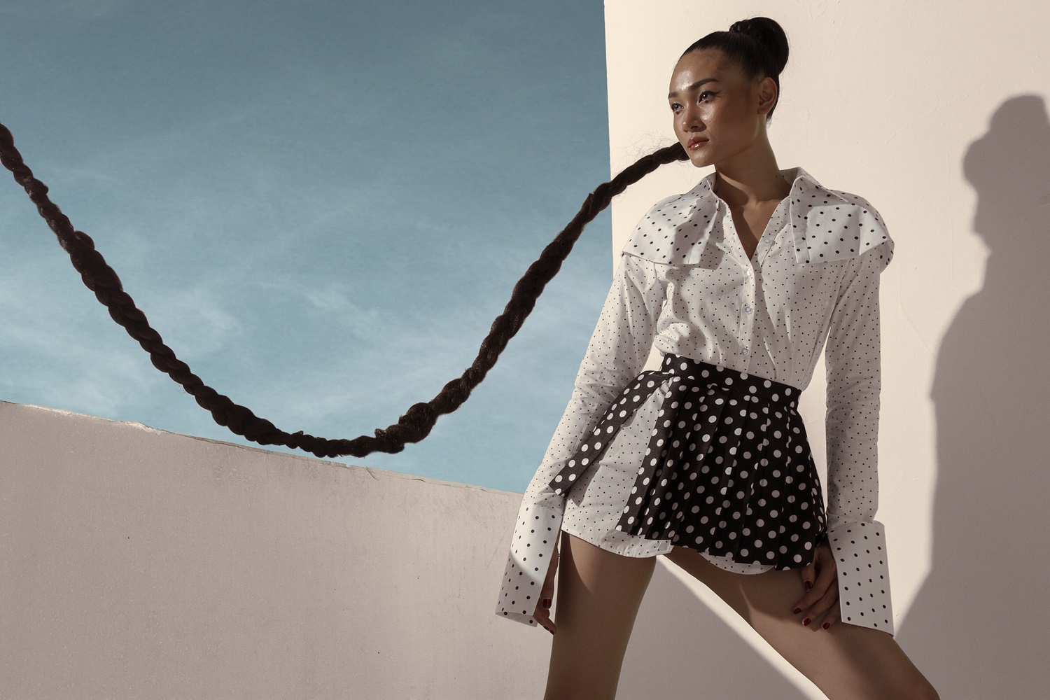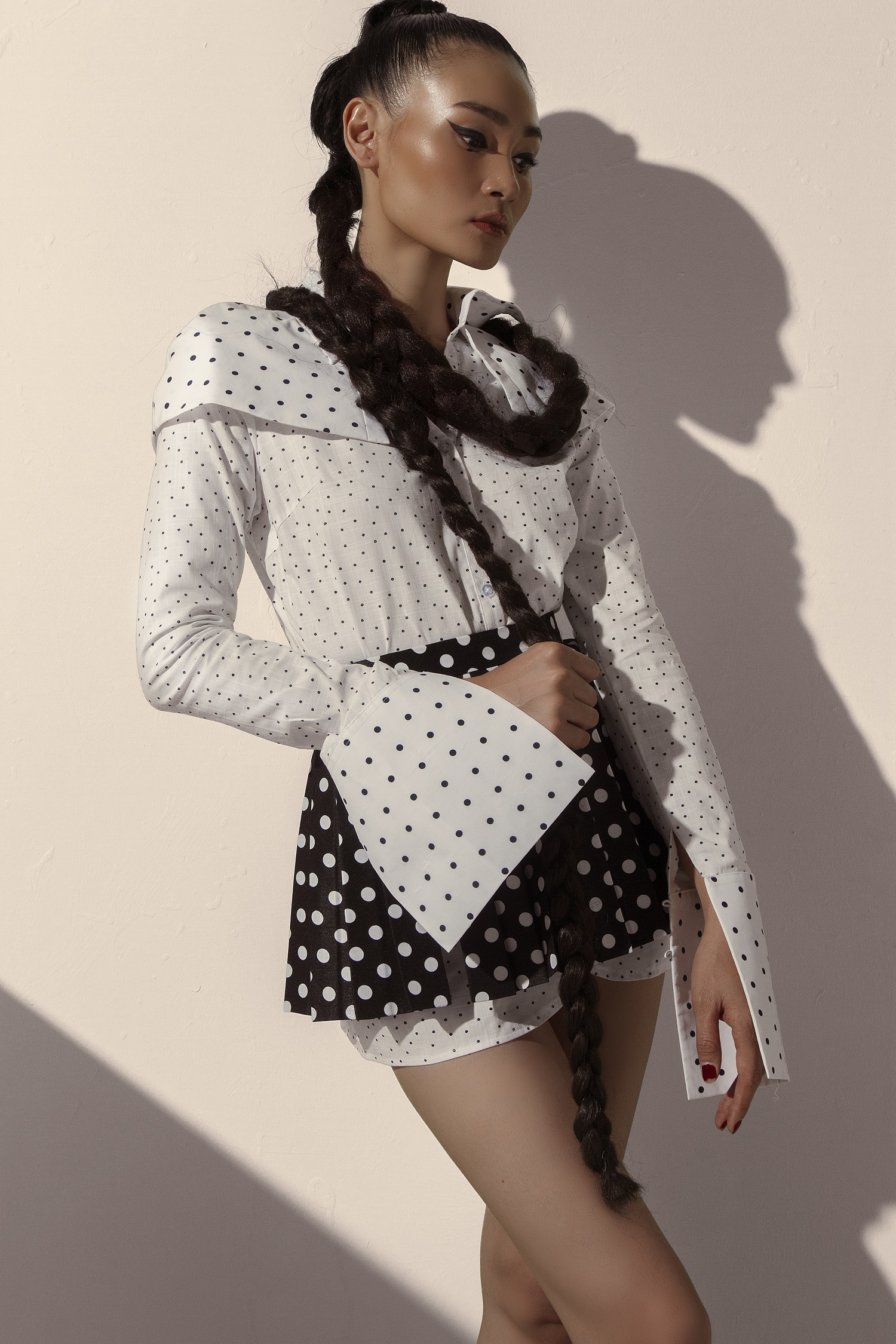 Chiếc đầm sơ mi dáng ngắn hoạ tiết chấm bi đen trên nền vải trắng giúp người mẫu khoe đôi chân thon gọn.