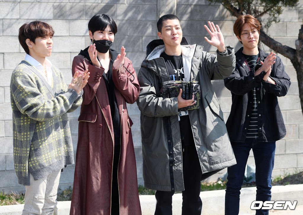 DongWoo (Infinite) (góc trái) cũng mặc cùng chiếc áo len này với sơ mi trắng trong lần tiễn thành viên SungYeol nhập ngũ