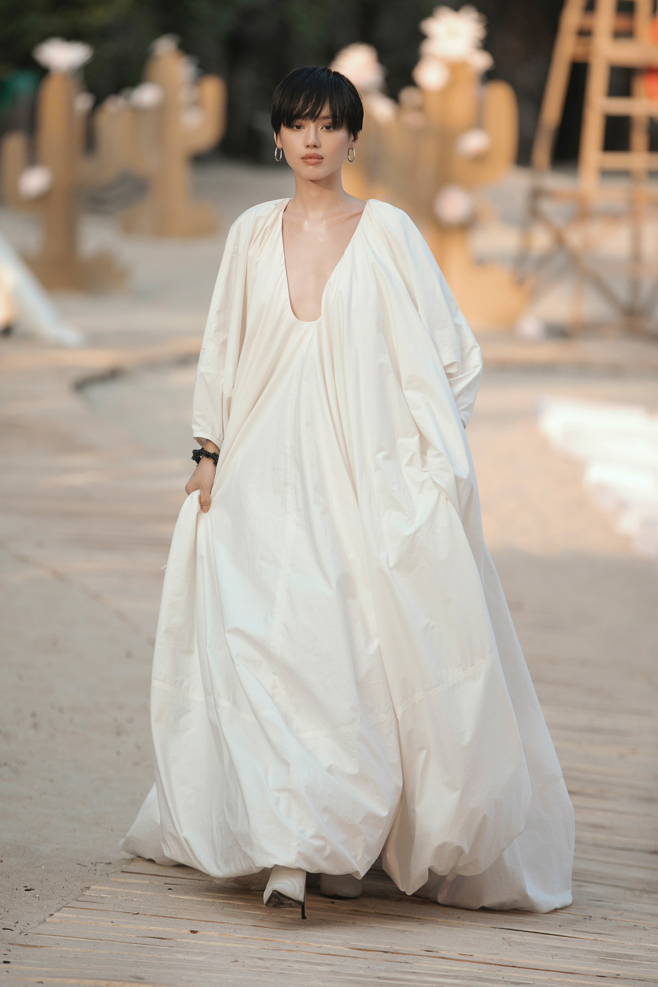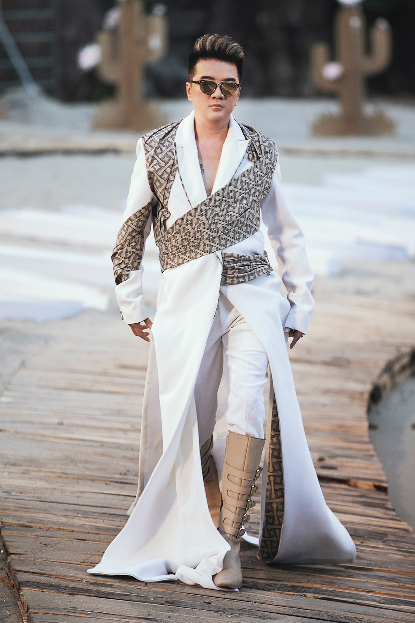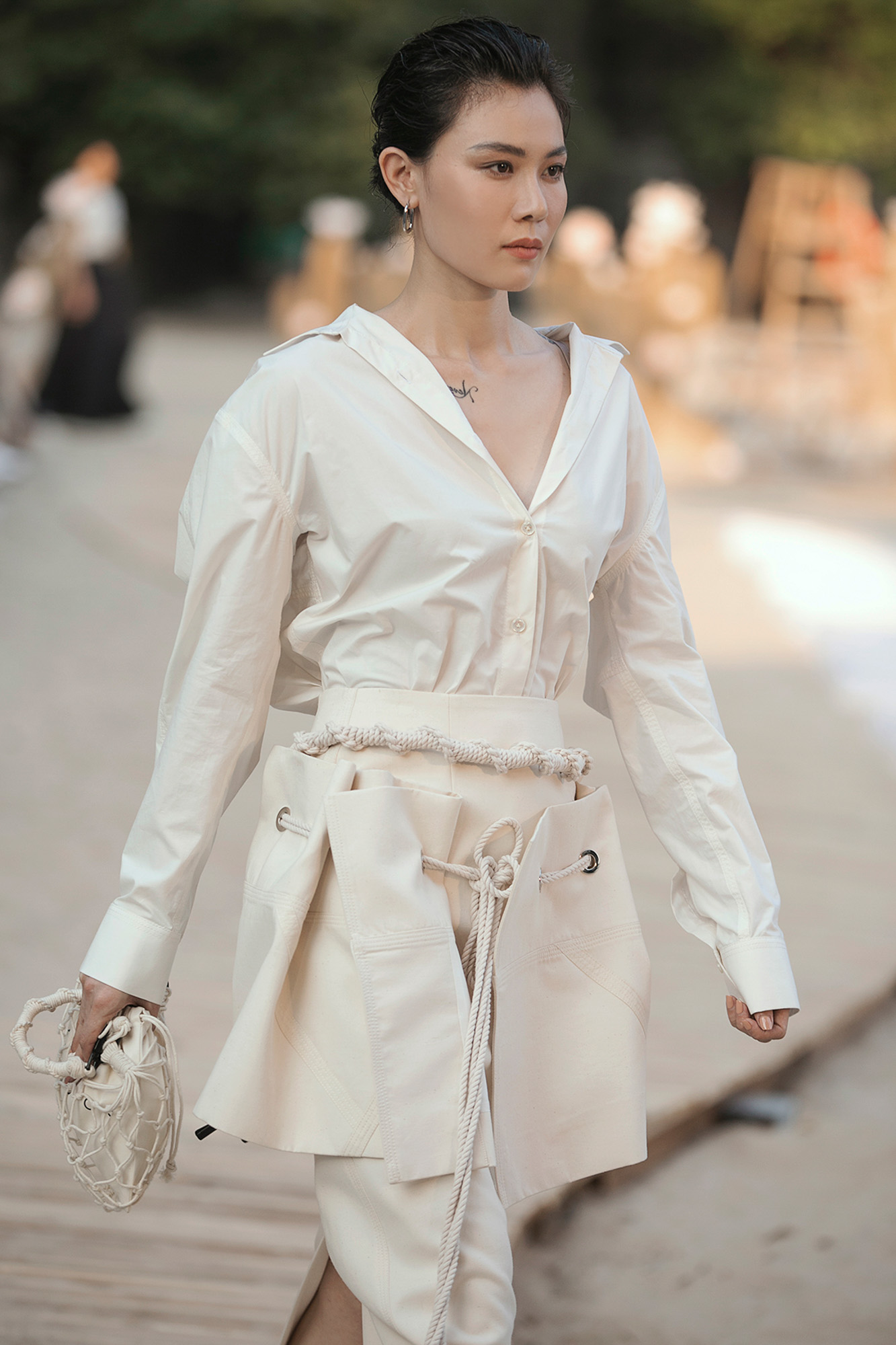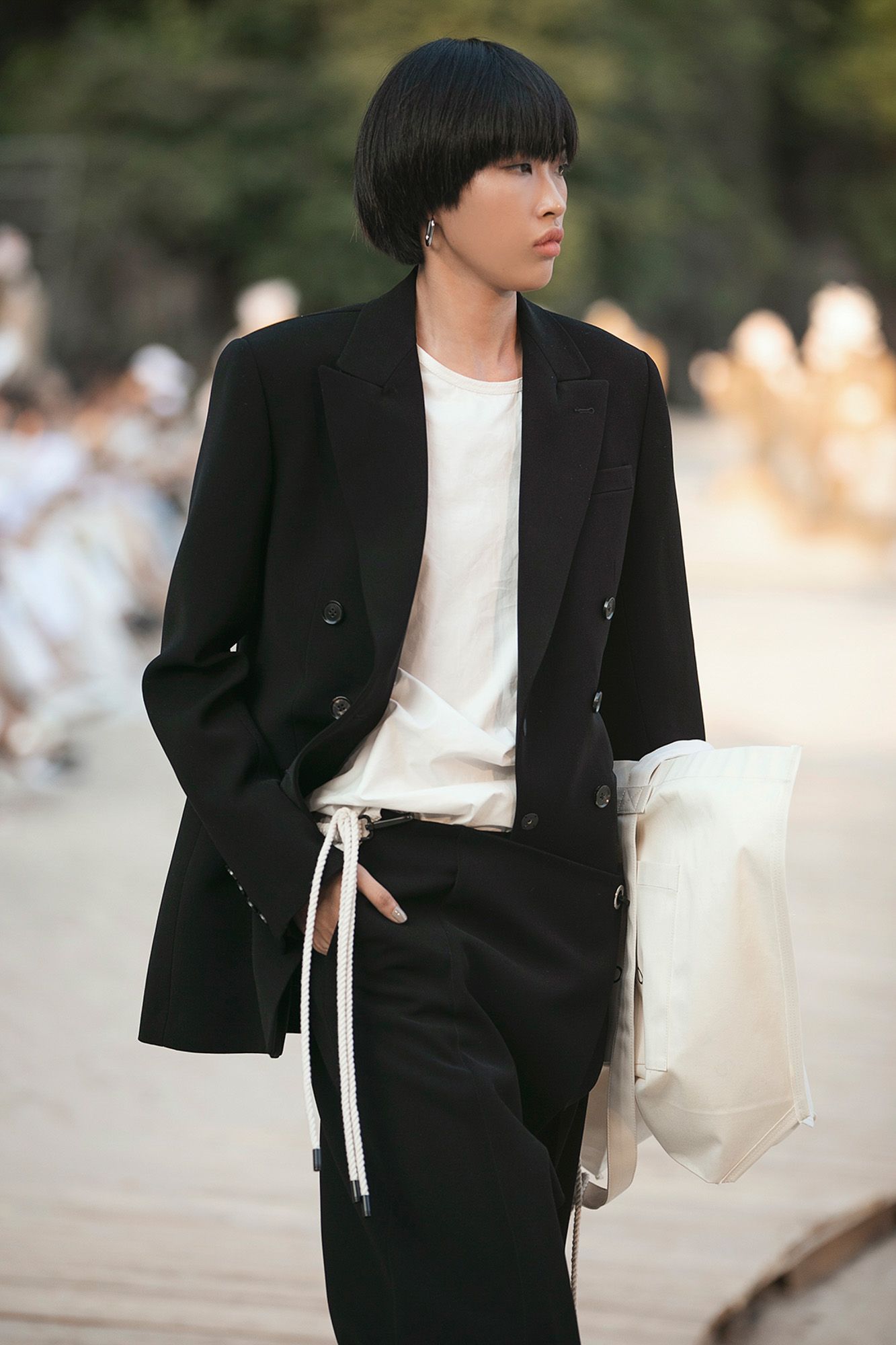 Đơn cử như với thiết kế của Lâm Gia Khang (phía trên) hay Nguyễn Tiến Truyển (phía dưới), cùng là mix với áo trắng nhưng từ sự khác biệt của chất liệu, phom dáng và cách sử dụng phụ kiện mà mỗi set đồ đều toát nên một tinh thần riêng.