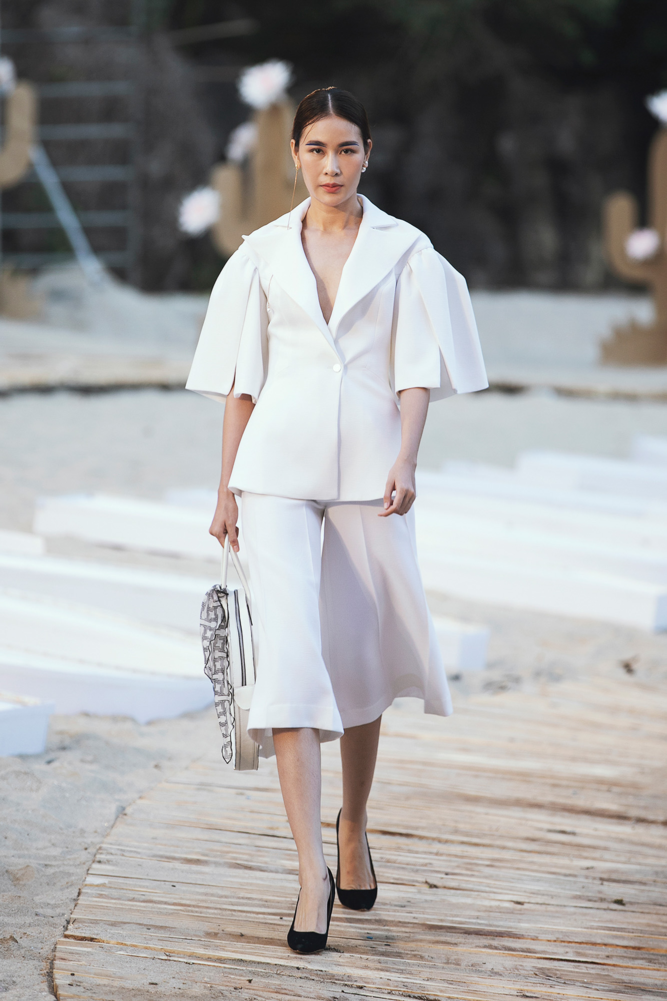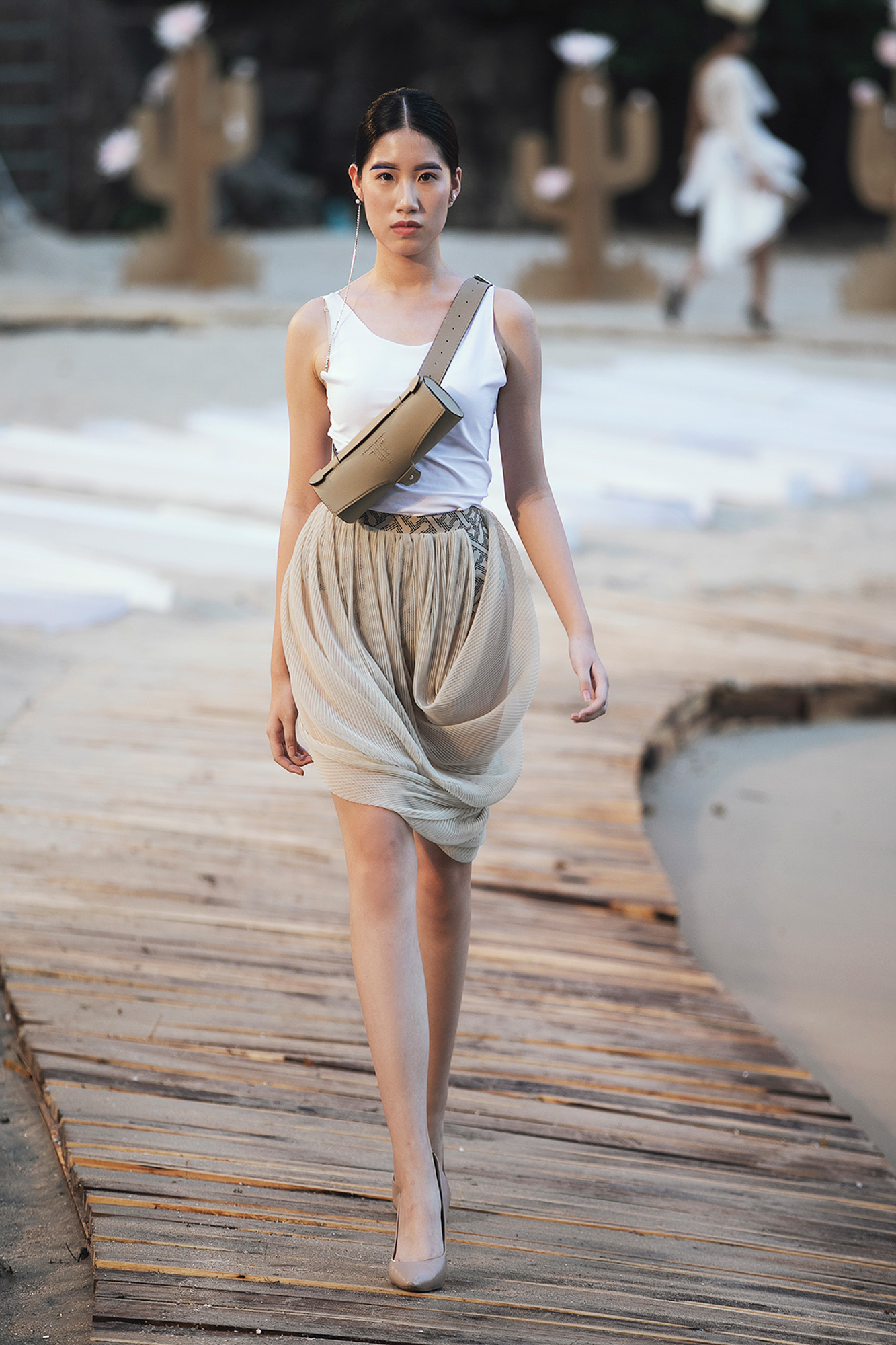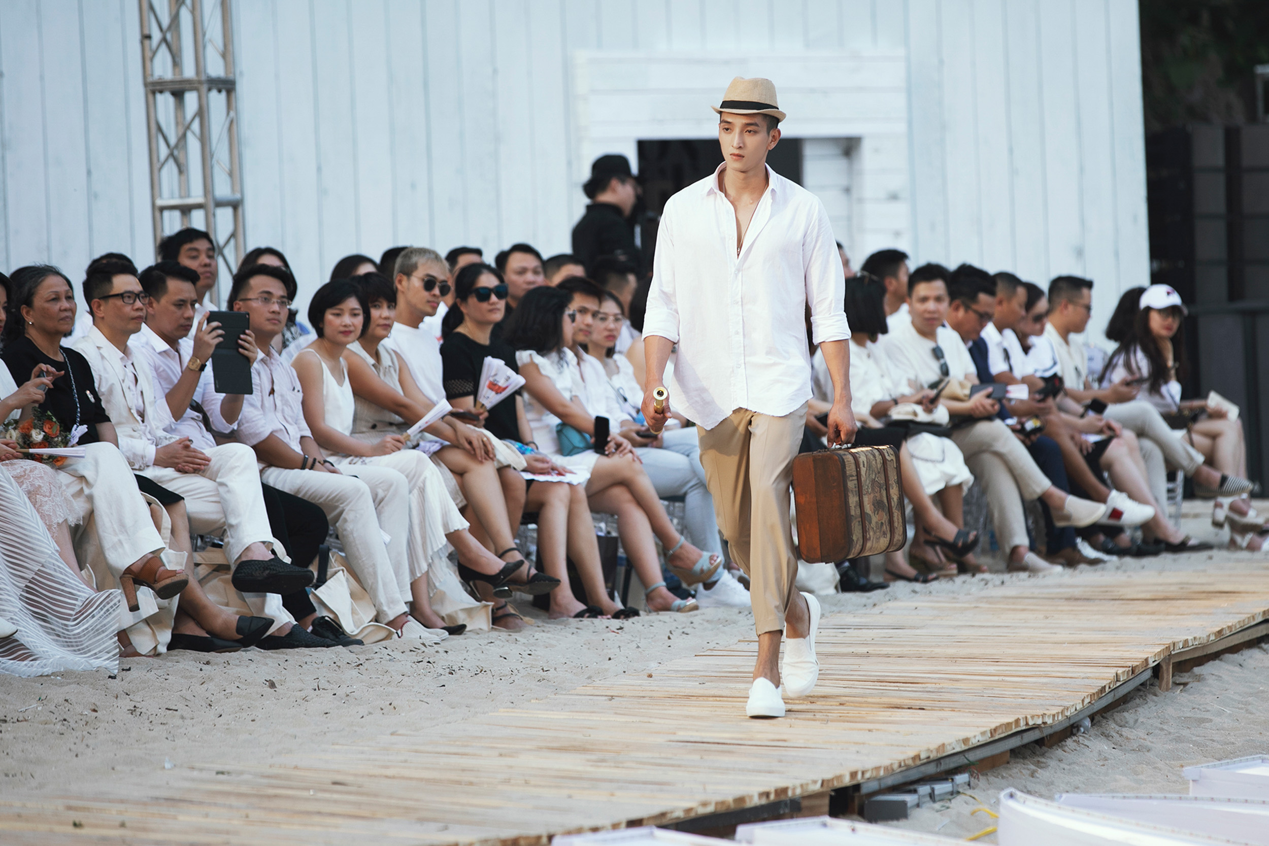 Đơn cử như với thiết kế của Lâm Gia Khang (phía trên) hay Nguyễn Tiến Truyển (phía dưới), cùng là mix với áo trắng nhưng từ sự khác biệt của chất liệu, phom dáng và cách sử dụng phụ kiện mà mỗi set đồ đều toát nên một tinh thần riêng.
