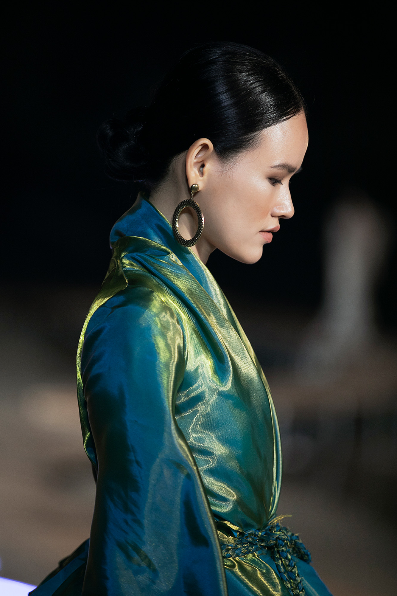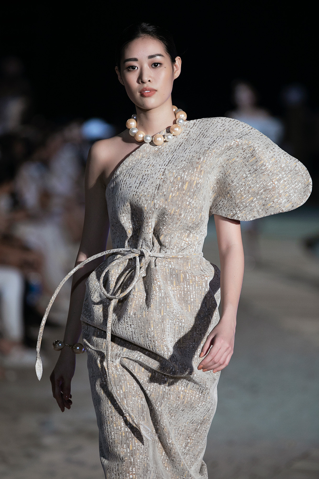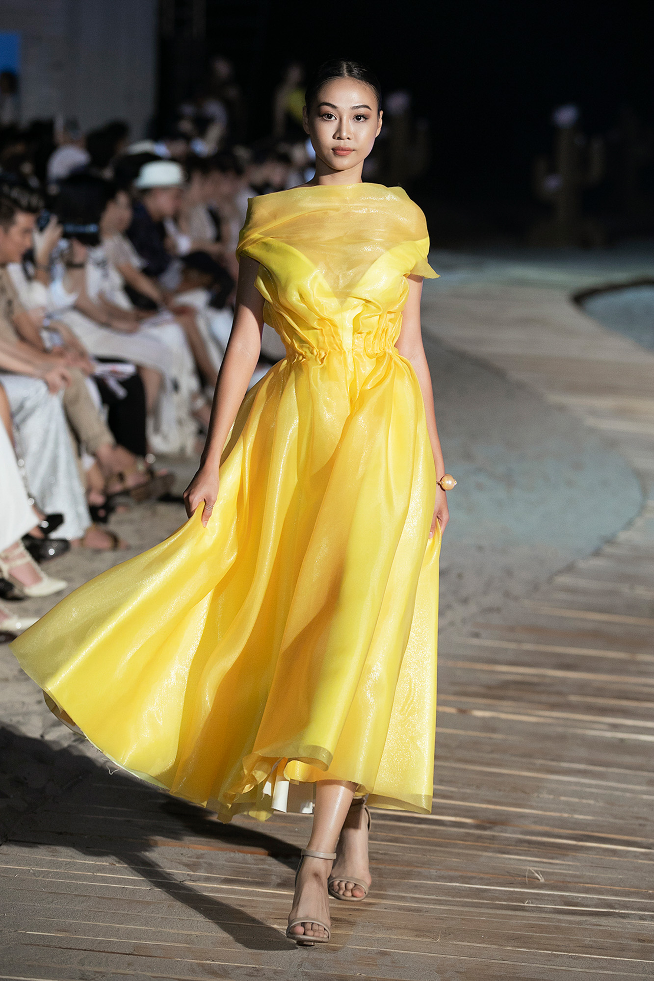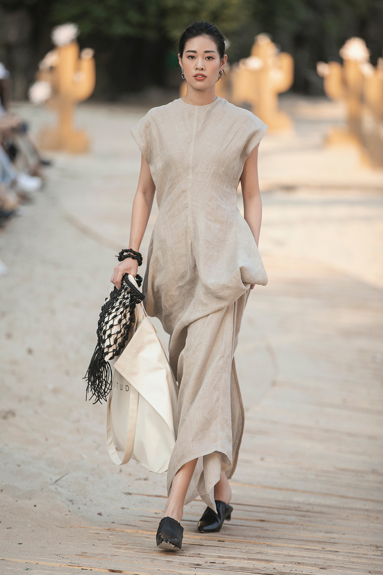 Đơn cử như với thiết kế của Lâm Gia Khang (phía trên) hay Nguyễn Tiến Truyển (phía dưới), cùng là mix với áo trắng nhưng từ sự khác biệt của chất liệu, phom dáng và cách sử dụng phụ kiện mà mỗi set đồ đều toát nên một tinh thần riêng.