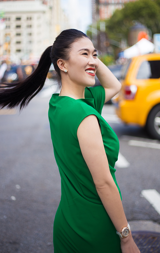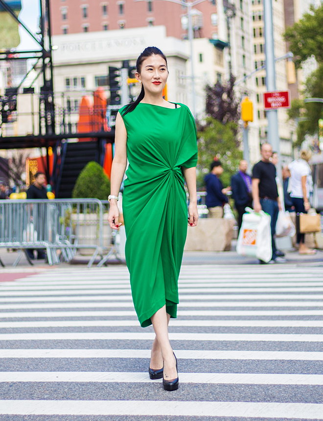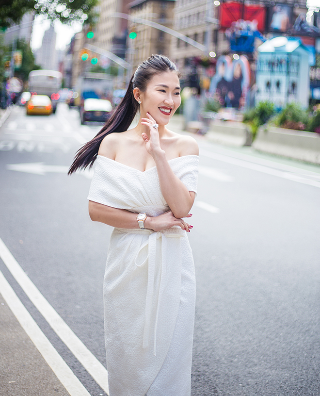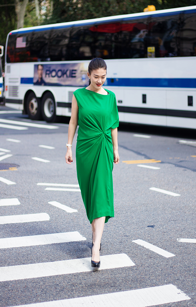 Trong lần công tác tại New York mới đây, bà mẹ xinh đẹp Thu Hằng đã thực hiện bộ ảnh khoe phong cách thời trang cá nhân. Dĩ nhiên, cựu tiếp viên hàng không xinh đẹp chọn những bộ cánh mà cô yêu thích. Hai thiết kế tông trắng và xanh đều nằm trong bộ sưu tập Domino 68 của Vũ Ngọc&Son trình làng cách đây không lâu. Thiết kế có màu xanh lục là một trong những trào lưu được hai nhà mốt Sài thành đón đầu. Đây cũng chính là mẫu váy Sarong dress được nhiều sao Việt yêu thích trong thời gian qua