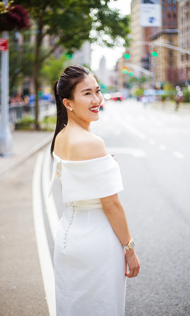 Bộ cánh tông trắng có phần trẻ trung hơn nhờ điểm nhấn trễ vai và xẻ tà cao. Cả hai thiết kế đều góp phần tạo dựng thành công phong cách thanh lịch, cổ điển cho nữ doanh nhân.