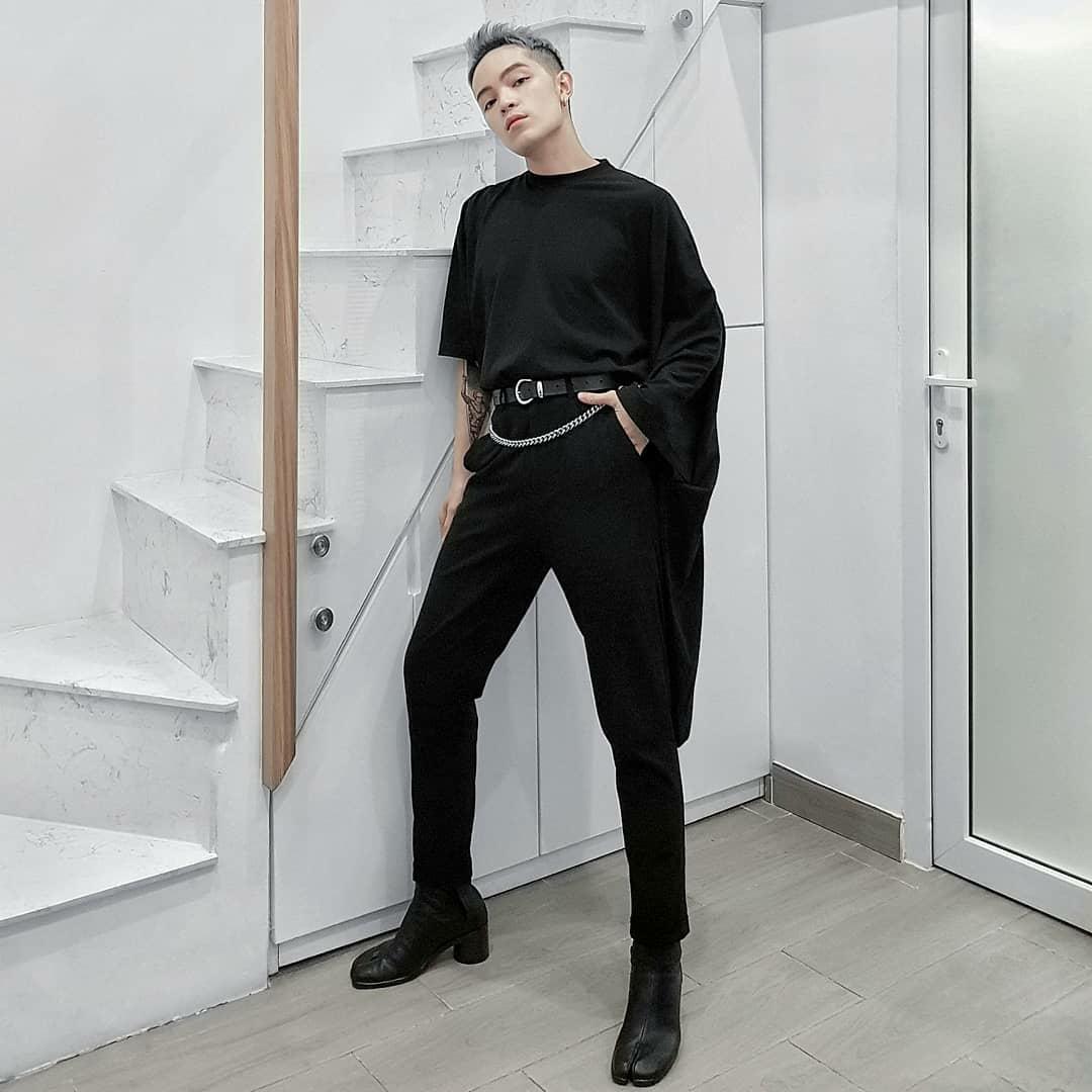 Tại Việt Nam, Kelbin Lei là sao Việt đầu tiên cập nhật xu hướng này. Để dễ mix, match, chàng stylist gốc Đà Lạt lựa chọn một thiết kế xẻ đôi cùng gam màu đen ấn tượng.