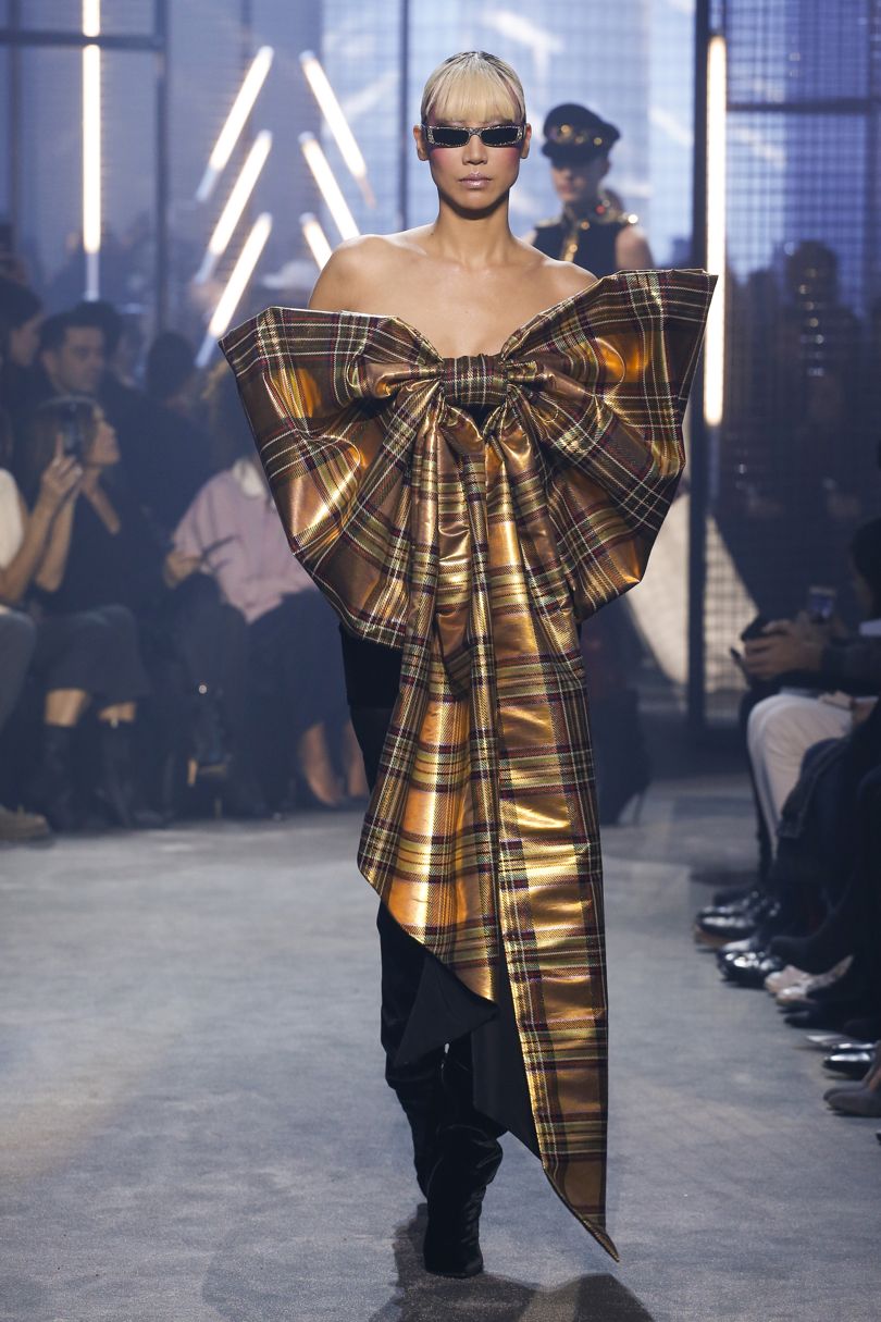Alexandre Vauthier lại lăng-xê xu hướng ca-rô cùng họa tiết nơ trong mẫu thiết kế này.