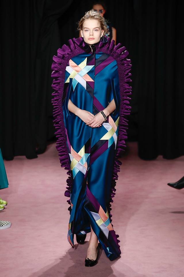 Valentino đem đến một thiết kế phủ kín người, cùng các chi tiết đính lông vũ che kín mặt. Tuy không hiểu ý đồ của NTK là gì, nhưng phải công nhận, đây là một bộ cánh bắt mắt.