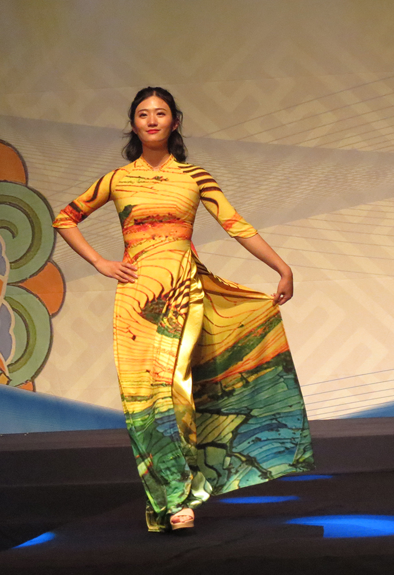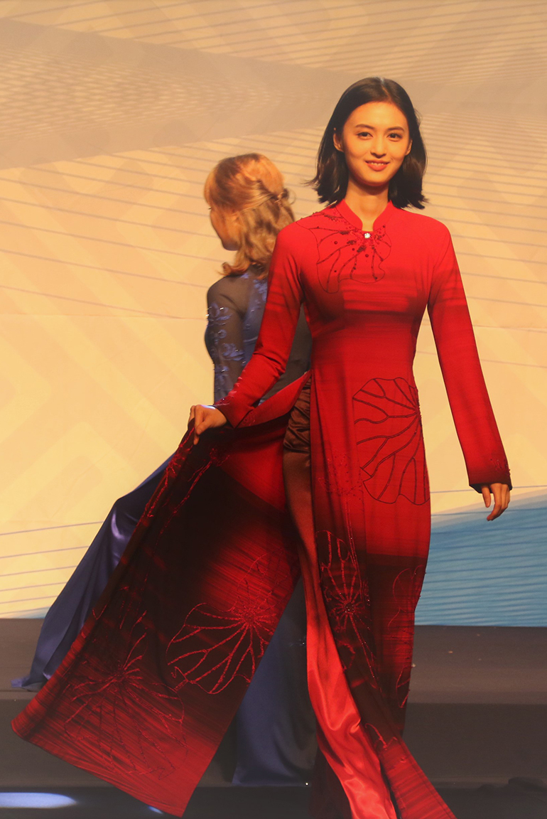 Đặc biệt, các mẫu trang phục áo dài được tạo nên bởi sự kết hợp hoàn hảo giữa chất liệu lụa truyền thống và các họa tiết vẽ tay, thêu đính đầy kỹ thuật từ các làng nghề truyền thống ở Việt Nam như thêu tay Mỹ Đức - Hà Tây, kim hoàn đá quý Hàng Bạc…