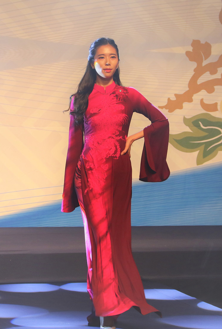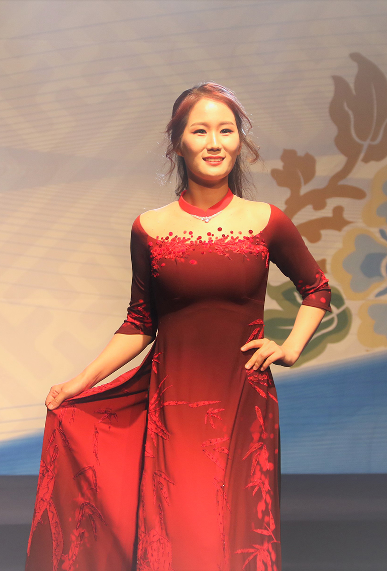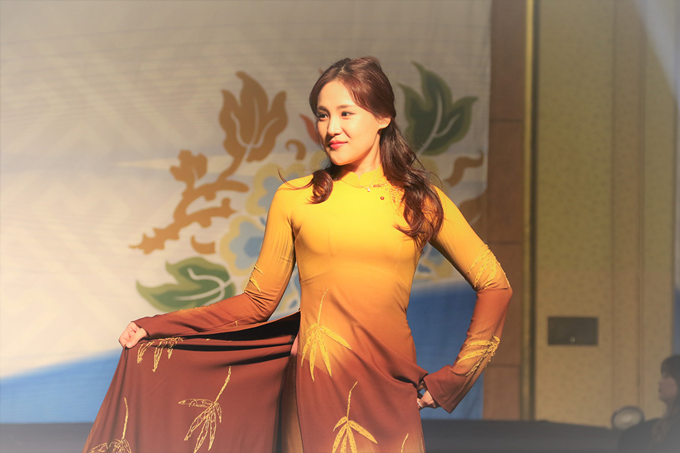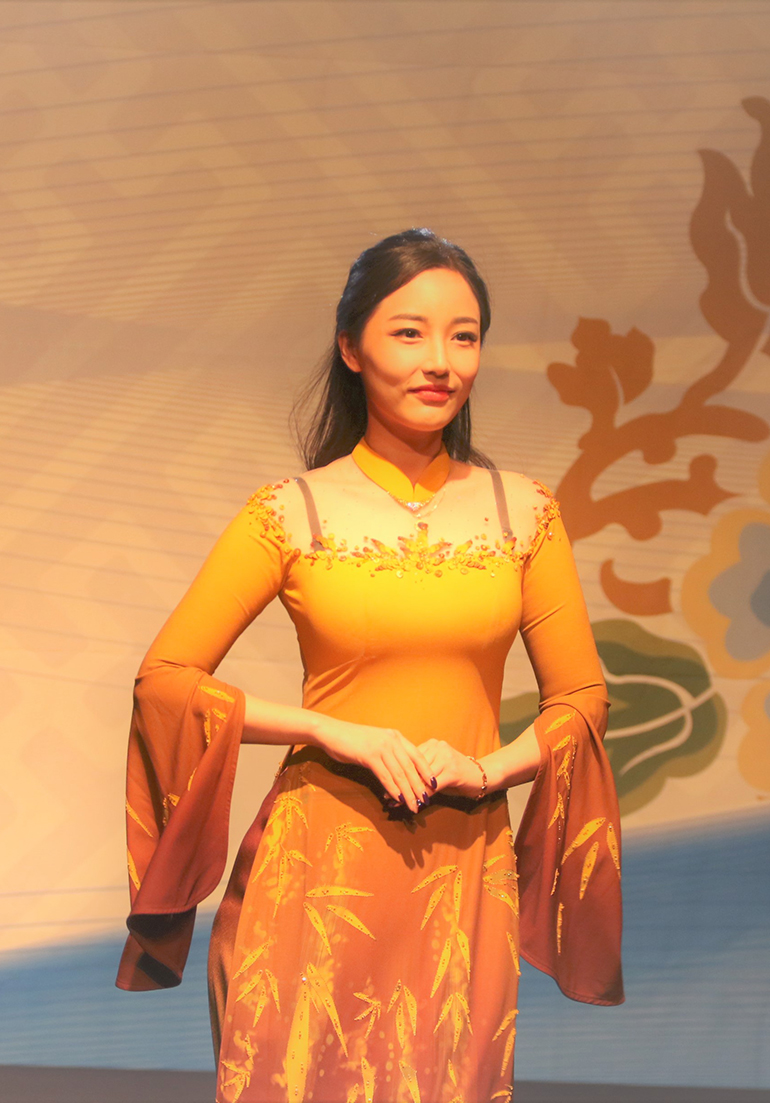 Với tông màu chủ đạo đầy huyền bí như: màu đỏ, màu vàng, màu tím, màu lam và các họa tiết hoa văn dân tộc như hoa sen, tre, họa tiết dân tộc Nhà thiết kế đã khai thác triệt để những hình ảnh và công năng trong 3 ngày tết để những giá trị văn hóa Việt Nam được chuyển tải vào những bộ trang phục áo dài mang đậm sắc màu truyền thống.