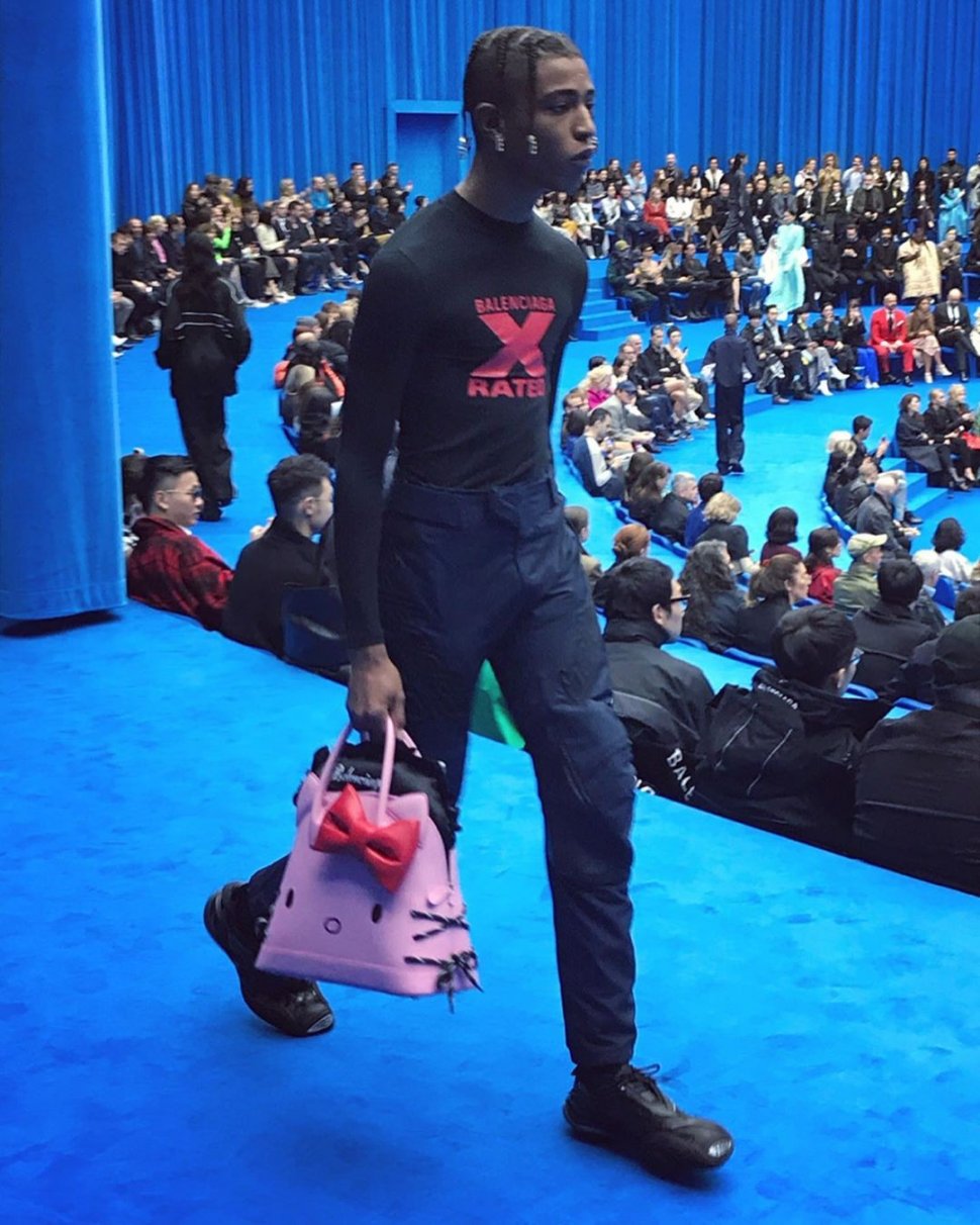 Nhà mốt nổi tiếng đã có một pha ‘vượt rào’ gây ấn tượng mạnh bởi cho người mẫu nam xách túi Kitty. Không giống chú mèo đáng yêu xuất hiện ở các cửa hàng thông thường, Kitty của Balenciaga được làm từ chất liệu da, phần râu mèo được kết hợp khéo léo với phần dây trang trí. Không thể bỏ qua chiếc nơ đỏ đặc trưng được thắt cực kỳ gọn gàng.
