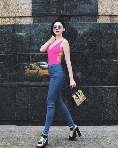 Tóc Tiên lại nổi bật hết mức cùng gam màu hồng chói chang. Nữ ca sĩ tự tin phối áo tắm cùng quần jeans ôm sát khi xuống phố.