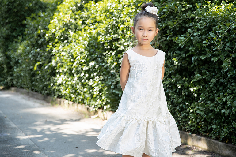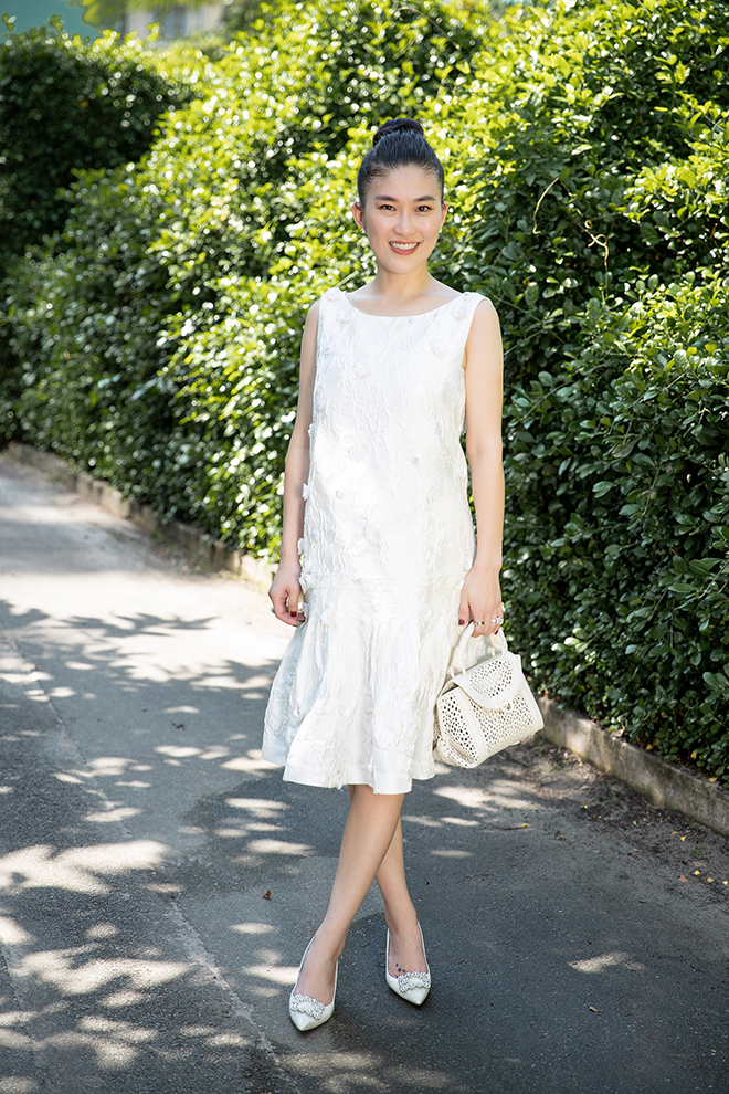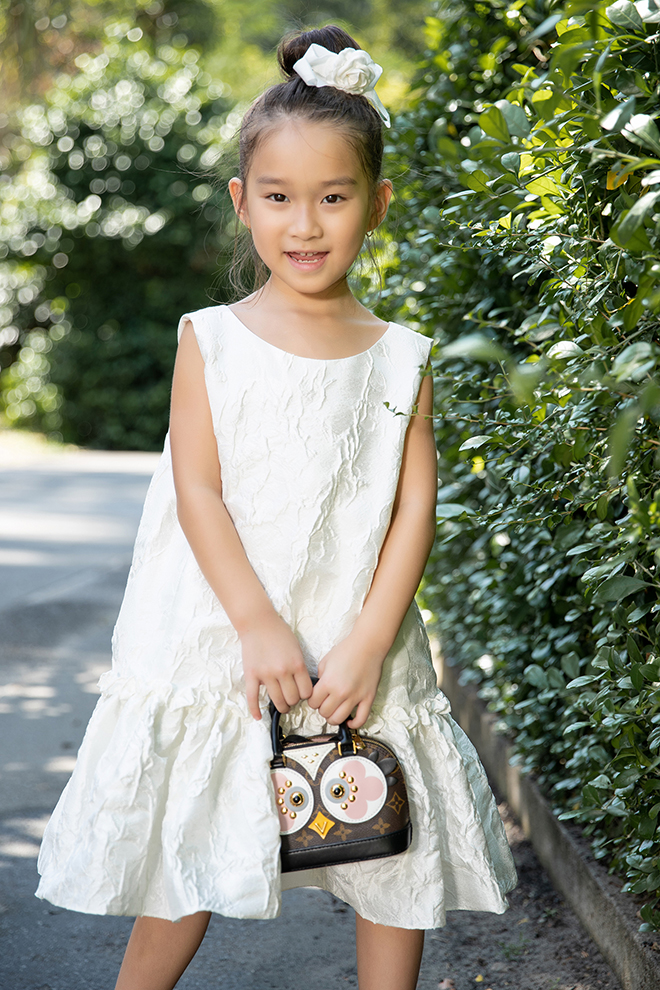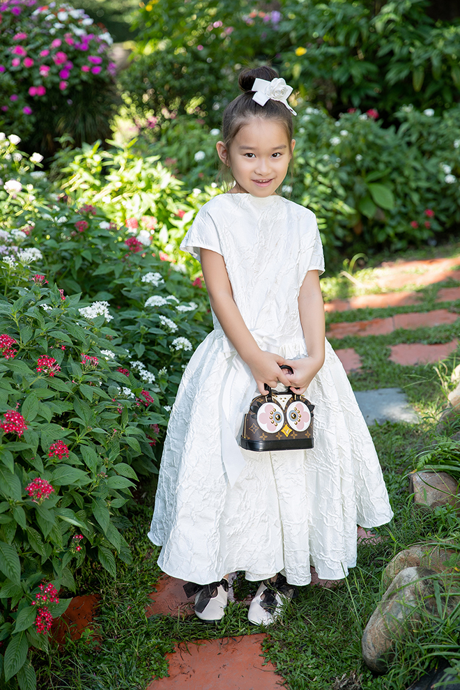 Những thiết kế Châu Hằng diện đều giúp cô toát lên vẻ đep lịch thiệp. Con gái của nữ doanh nhân duyên dáng không kém mẹ khi diện những thiết kế mang mau sắc loài hoa trà my. Bé tạo dáng sành điệu, chuyên nghiệp không thua kém mẹ.