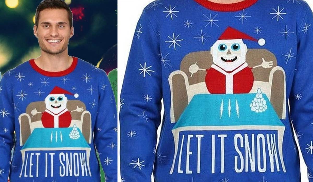 Chiếc áo len ‘tội đồ’ in hình ông già Noel đang ngồi trước ba hàng bột trắng được đóng gói gọn gàng, chưa kể slogan ‘Let It Snow’ (hãy để tuyết rơi) được in bên dưới.