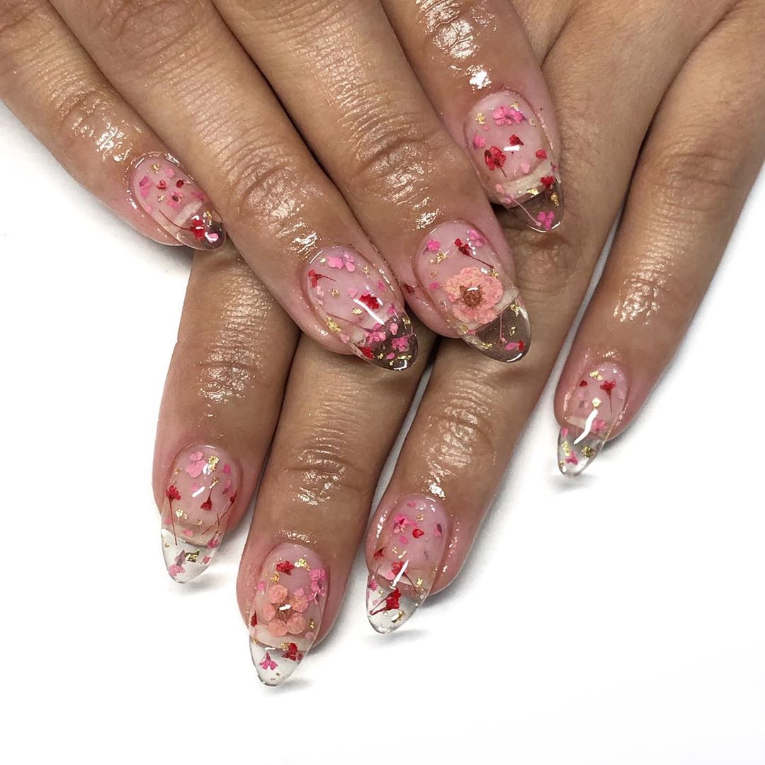 Bộ móng tay acrylic trong suốt với hoa khô không chỉ dành cho dịp Valentine mà bạn có thể đeo nó trong suốt mùa xuân năm 2020. Bộ nail ngoạn mục này được chia sẻ trên tài khoản instagram mannequin.hands.