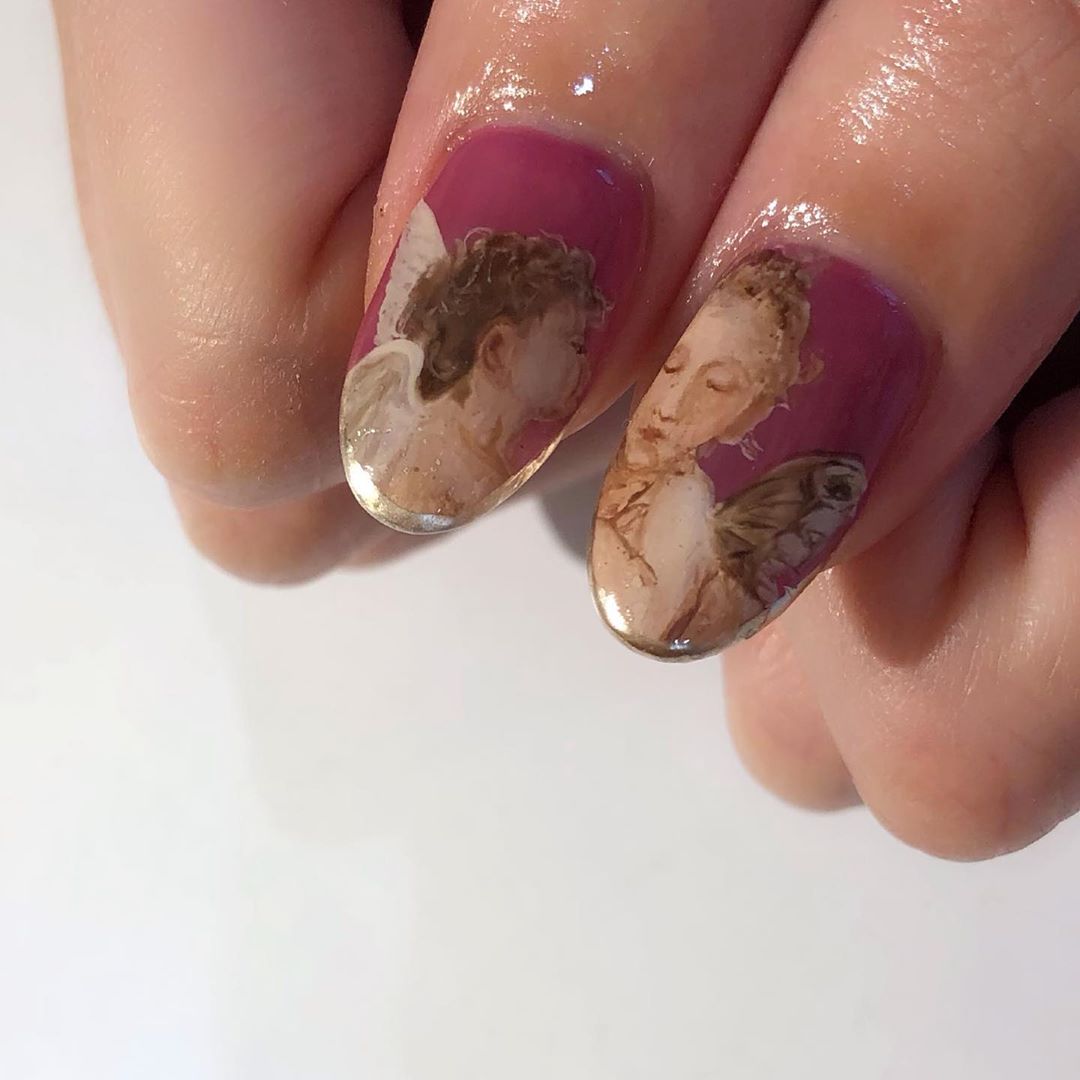 Cherub chính là tên gọi của thiên thần nhỏ đáng yêu. Các thiên thần theo truyền thống hỗ trợ bên ngai Thiên Chúa và đóng vai trò là những linh hồn giám hộ. Thiên thần trên ngón tay của chúng ta là một em bé dễ thương, mũm mĩm với đôi cánh. Bộ nail Cherub được thực hiện bởi instagram oioioio.