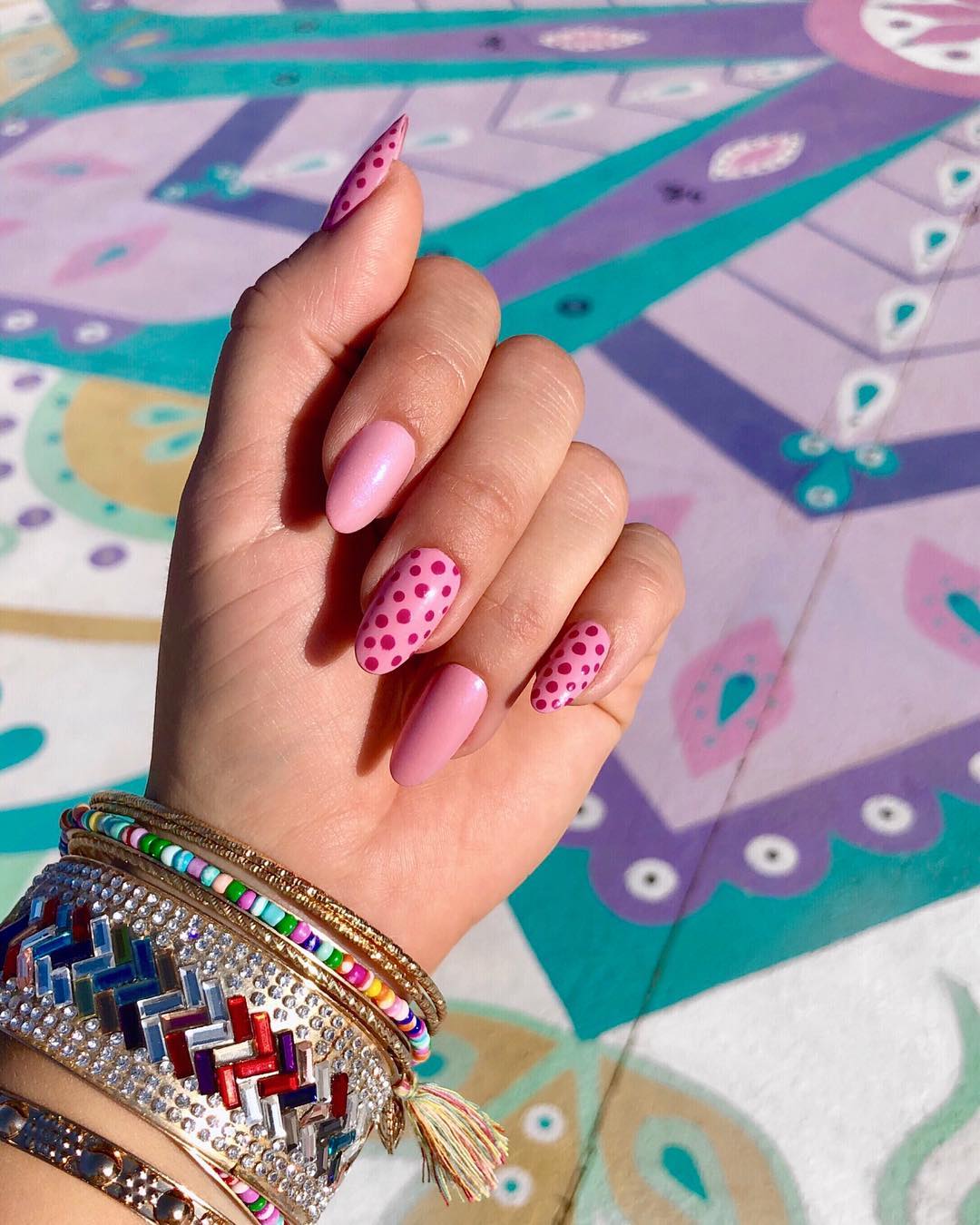Nhắc đến tình yêu, tất cả mọi người đều liên tưởng đến màu hồng và màu đỏ. Bộ nail chấm bi hồng của julieknailsnyc là sự lựa chọn phù hợp cho Valentine. Sau một vài tuần nếu màu sơn chưa phai đi, bạn vẫn có thể để nguyên mà không lo bị chê sến.