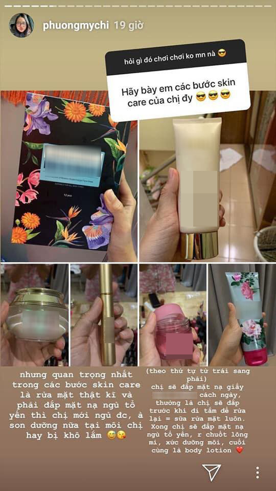 Phương Mỹ Chi chia sẻ rằng, mỗi ngày cô sẽ thực hiện các bước dưỡng da như sau: Đắp mặt nạ giấy => rửa mặt => đắp mặt nạ tổ yến => chốt mi => dưỡng môi => thoa kem dưỡng thể.