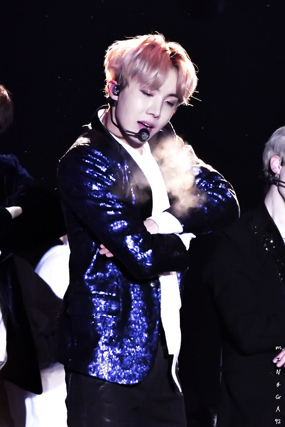 Lại một thành viên của BTS nghiện đánh mắt màu tím và hồng. Gương mặt với đường nét mờ nhạt và có phần nữ tính của J-Hope càng trang điểm đậm lại càng lộ khuyết điểm.