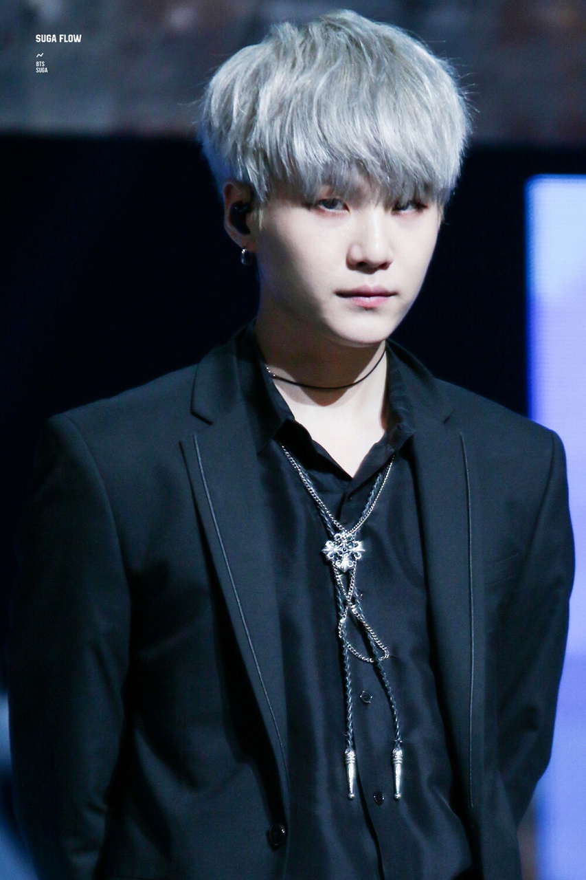 Rapper của nhóm chưa bao giờ được đánh giá cao về nhan sắc. Lúc đứng trên sân khấu với lớp trang điểm dày cộm cũng là lúc mặt mũi anh chàng khó coi nhất. Suga thường xuyên đánh phấn mắt màu hồng và đỏ, vốn là những màu khó nhằn chỉ dành cho người có đường nét mắt rõ ràng. Màu rượu vang khiến đôi mắt của anh chàng như càng sưng húp.