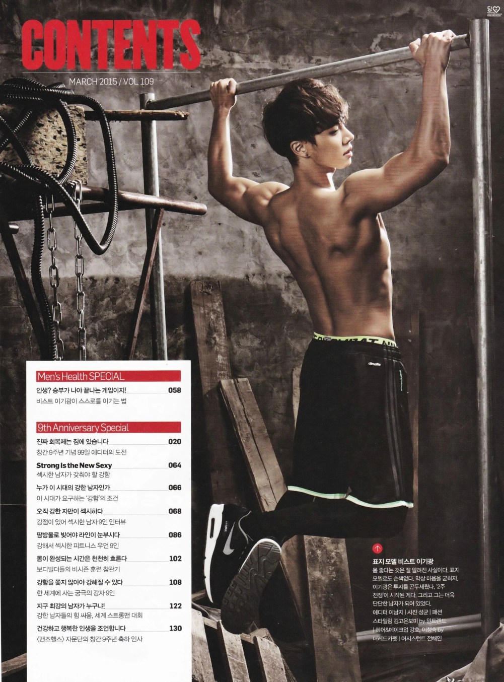 Sự xuất hiện bất ngờ của Gikwang trên tạp chí Men’s Health làm fan nổ đom đóm mắt. Ai có thể tin được ‘cún con’ ngày nào đã có cơ bụng 6 múi chắc khỏe thế này.
