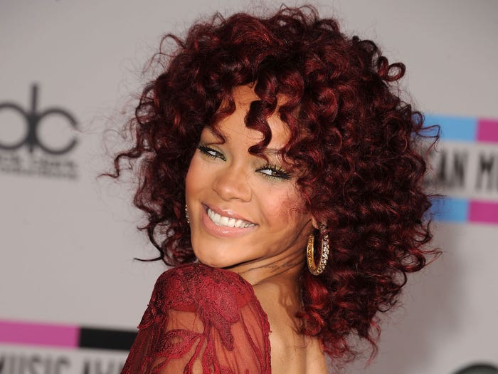 1. Năm 22 tuổi, Rihanna đã từng để mái tóc đỏ xù mì. Cô mặc chiếc váy ren cùng tông đỏ đến tham dự American Music Awards 2010.