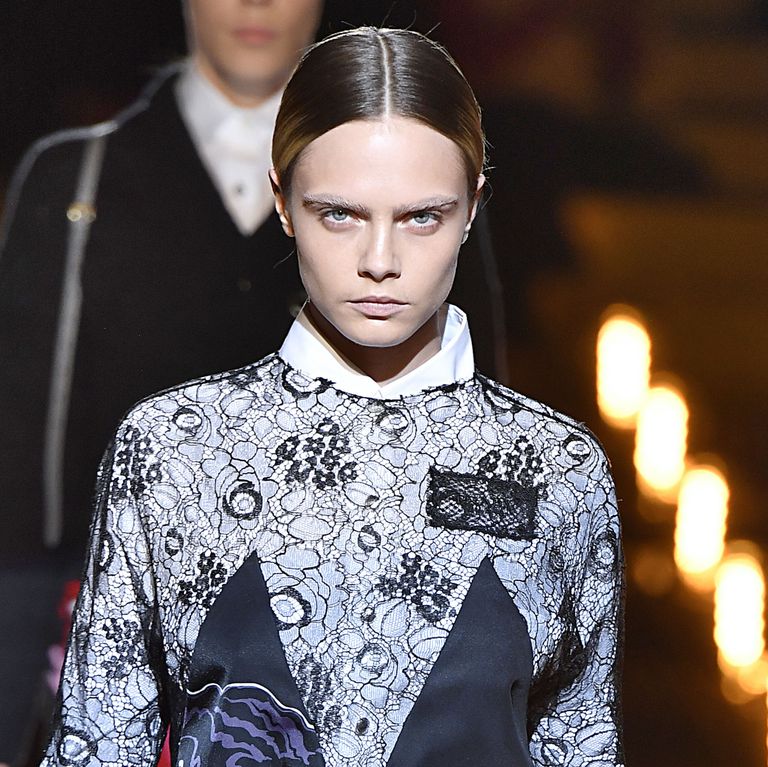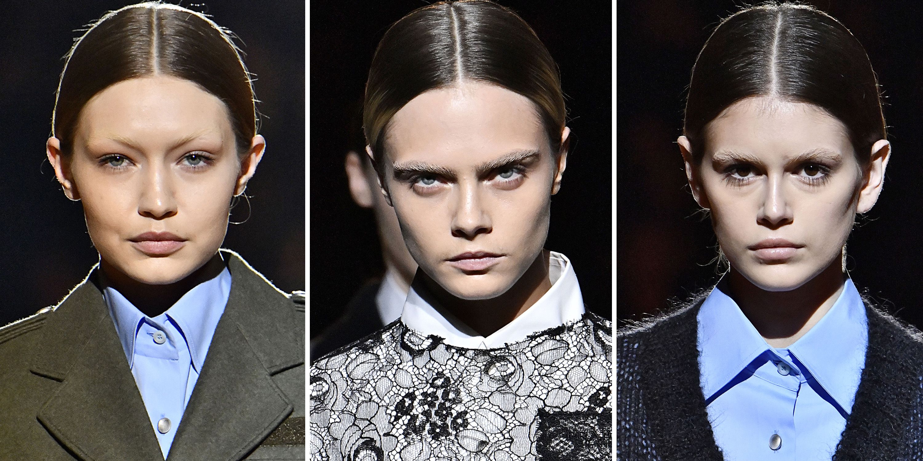 Tất cả các siêu mẫu xuất hiện trên sàn catwalk đều cột tóc thấp, rẽ ngôi giữa, bôi keo bóng và đặc biệt là phải tẩy sạch lông mày. Từ Gigi Hadid với cặp lông mày xếch cá tính đến ‘nữ hoàng lông mày rậm’ Cara Delevingne đều phải hy sinh niềm tự hào của mình vì đại cục.