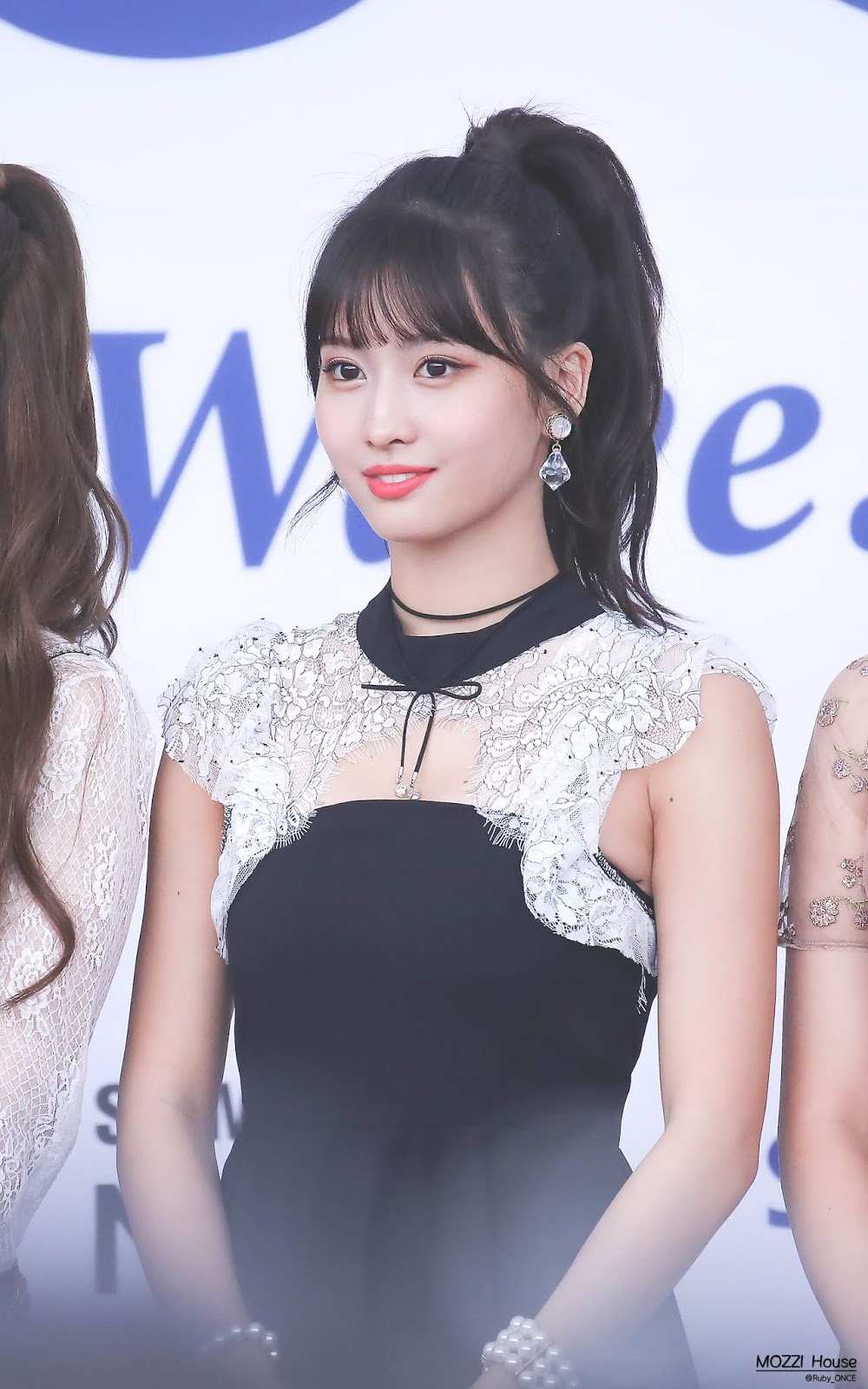 Momo (Twice) buộc tóc đuôi ngựa làm nổi bật đường nét gương mặt hơn: Gò má hơi cao, xương quai hàm sắc sảo.