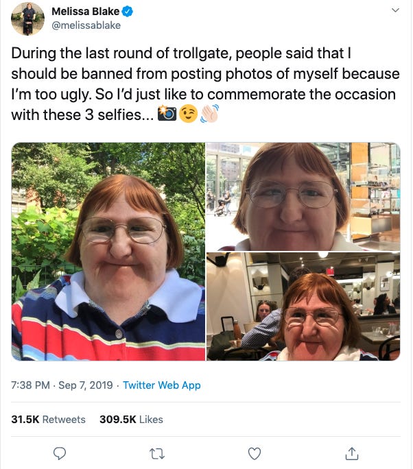 Melissa Blake là một nhà báo tự do, viết về việc sống chung với hội chứng Freeman-Sheldon (một bệnh di truyền xương và cơ bắp hiếm gặp). Vào tháng 9, sau khi nhận được hàng nghìn chỉ trích chê bai ngoại hình mình quá xấu xí để đăng ảnh tự sướng, cô đã chia sẻ một loạt ảnh tự sướng trên Twitter cùng thông điệp vượt lên khó khăn, bệnh tật để bản thân sống vui khỏe. Ảnh tự sướng của cô đã nhận được hơn 31.000 lượt tweet lại và vô số phản hồi ủng hộ.