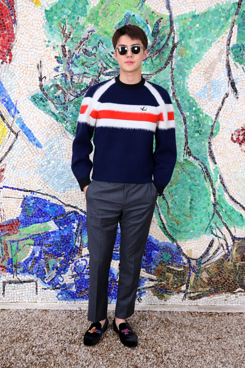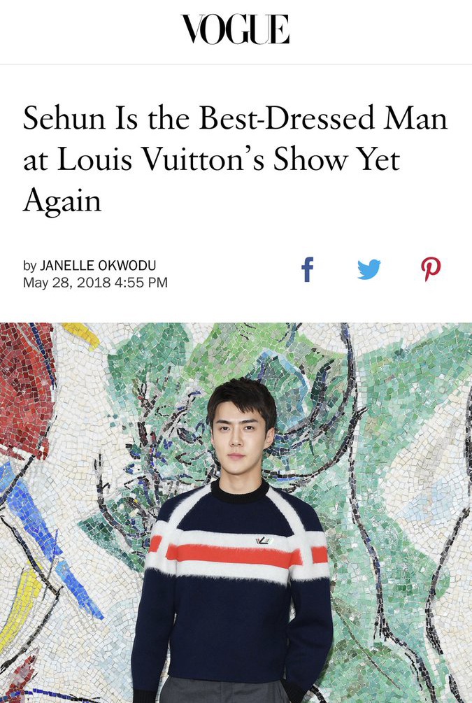 Sau hình ảnh huyền thoại của mình vào năm 2017, Sehun lại được mời đến ngồi hàng ghế đầu trong Louis Vuitton’s Resort 2019 năm nay. Anh chàng ăn mặc đơn giản với chiếc áo len phối 3 màu xanh navy, đỏ, trắng với quần tây màu lông chuột, tóc vuốt keo nhẹ nhàng và gương mặt trang điểm với lớp nền siêu tự nhiên, không có eyeliner. Lại một lần nữa Vogue không tiếc lời khen chàng em út của EXO là nam khách mời mặc đẹp nhất tại show diễn của Louis Vuitton.