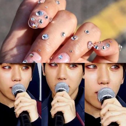 Stylist của EXO lần này còn rất có tâm khi cẩn thận đính pha lê vào tay Baekhyun. Làm nail xưa rồi, giờ các chị em đang cầu trời SM Ent sẽ tung video hướng dẫn làm ngón tay như Baekhyun cơ.