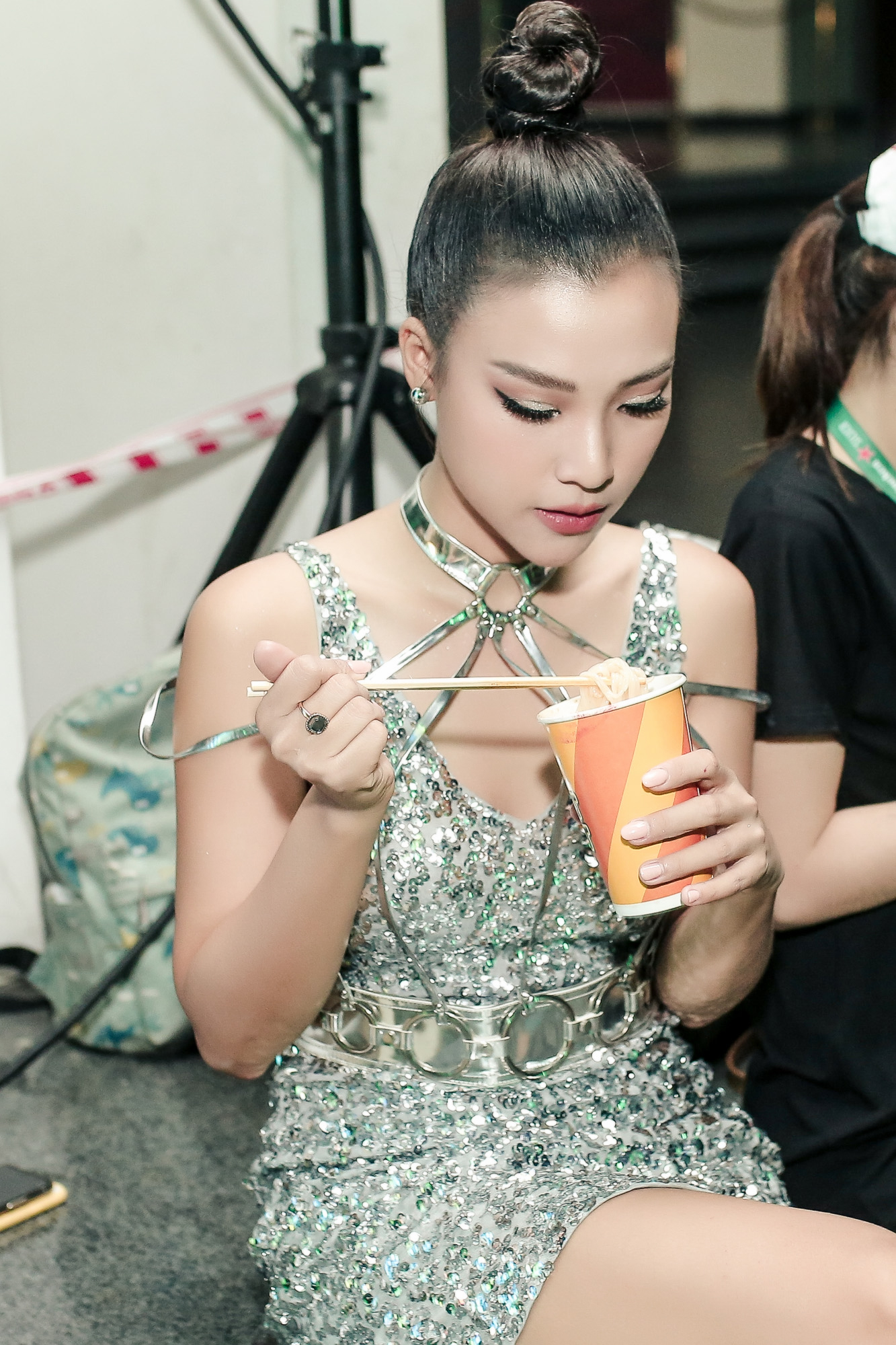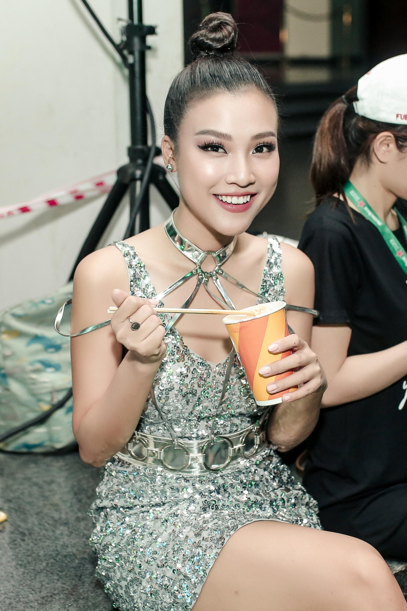 Do thời gian khẩn trương, người đẹp cũng nhờ ekip chương trình mua hộ mì ly và ăn vội ngay sau hậu trường sân khấu.