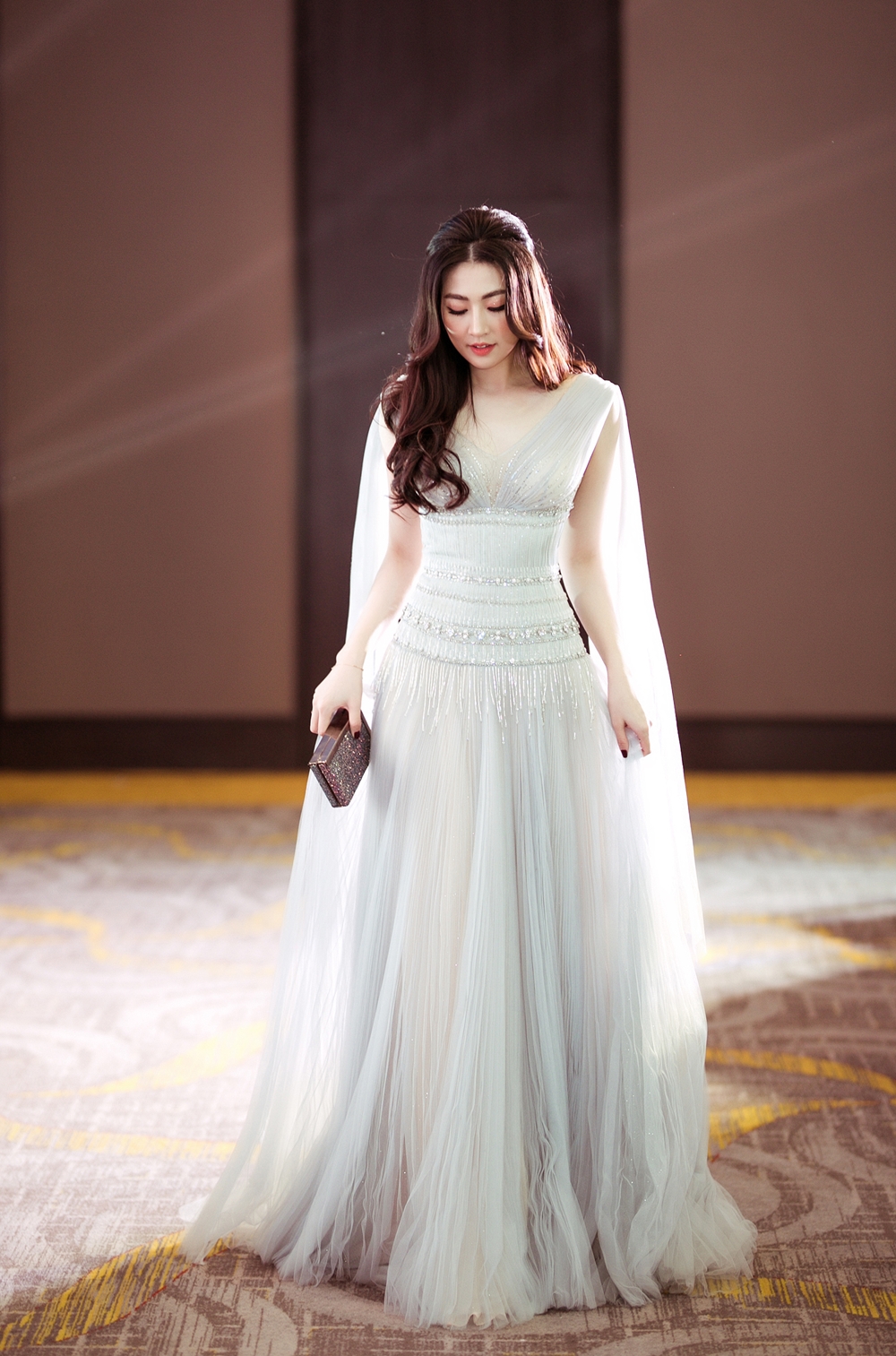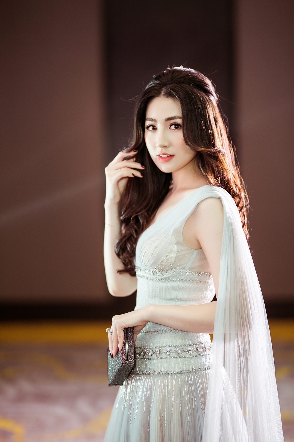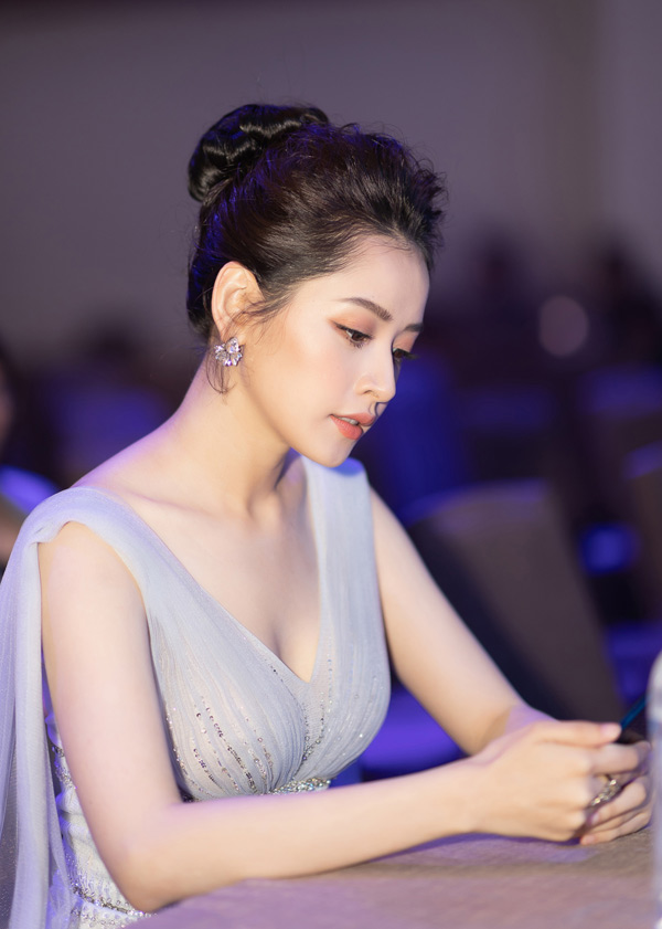 Diện chiếc đầm dài thướt tha, bới tóc đơn giản theo phong cách đài các, Tú Anh trở thành tâm điểm và tỏa sáng tại sự kiện.