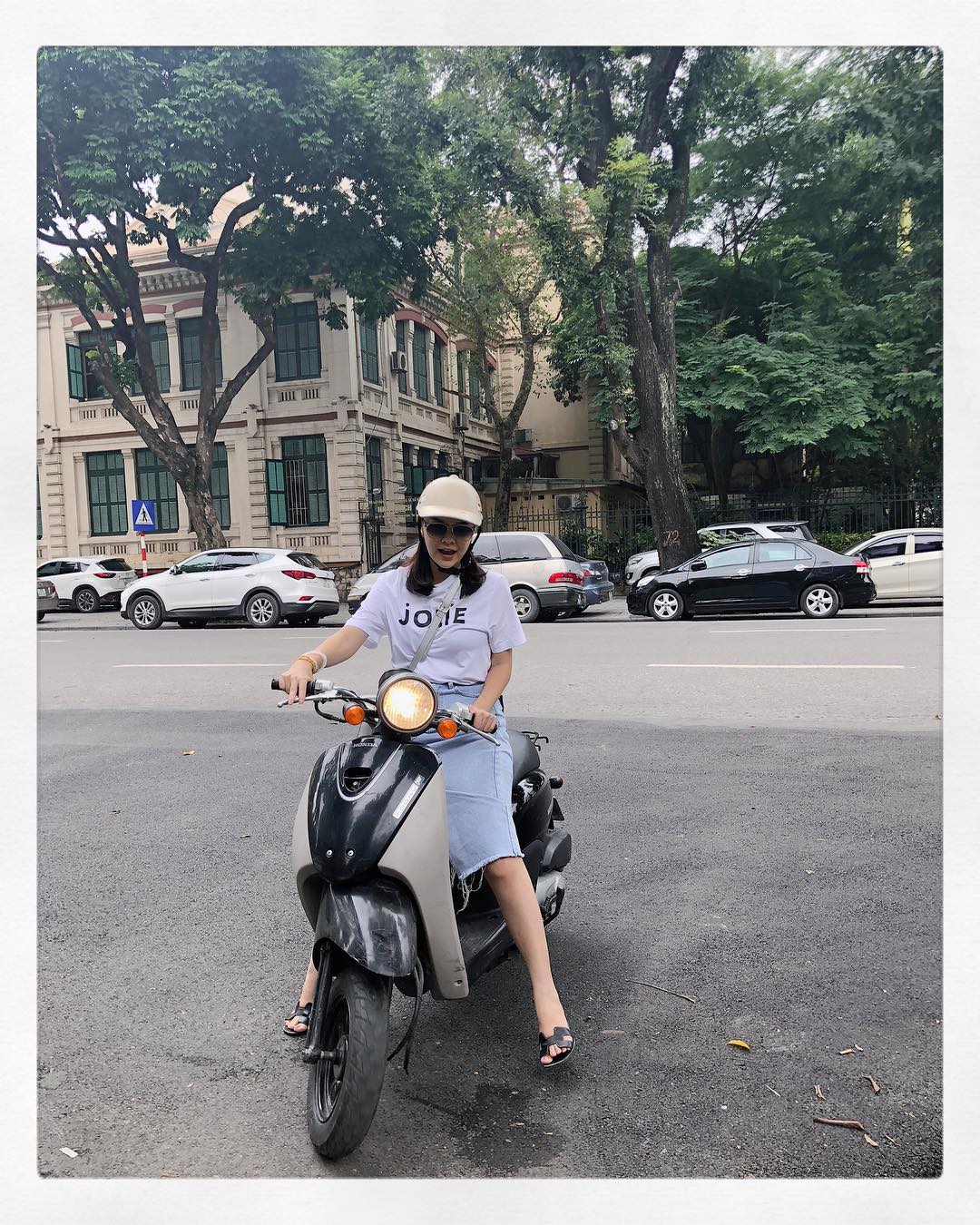 Nhìn Phạm Quỳnh Anh mà xem, trông cô cực kỳ trẻ trung, năng động với combo áo phông trắng và chân váy jeans xanh nhạt.