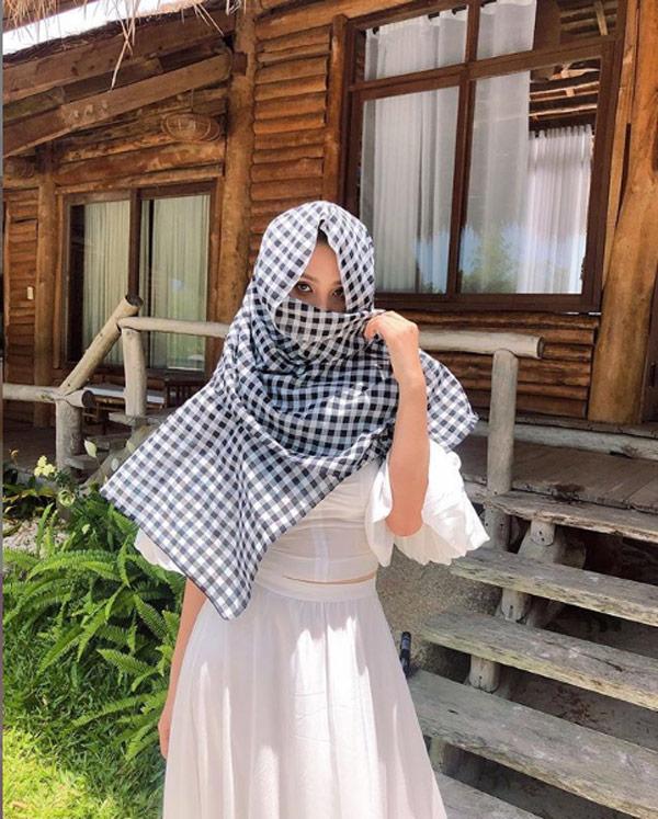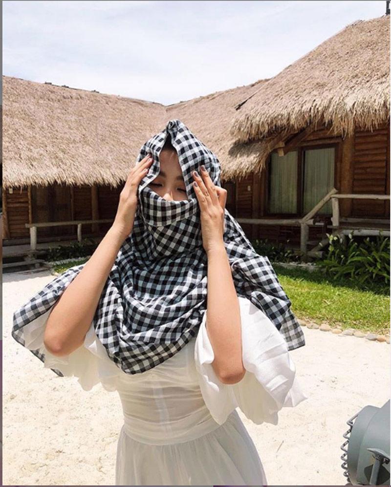 Hoa hậu Tiểu Vy cũng phải tìm cách “cứu nguy” cho làn da của mình. Người đẹp chọn phủ kín mặt bằng chiếc khăn rằn, chỉ chừa đúng đôi mắt.