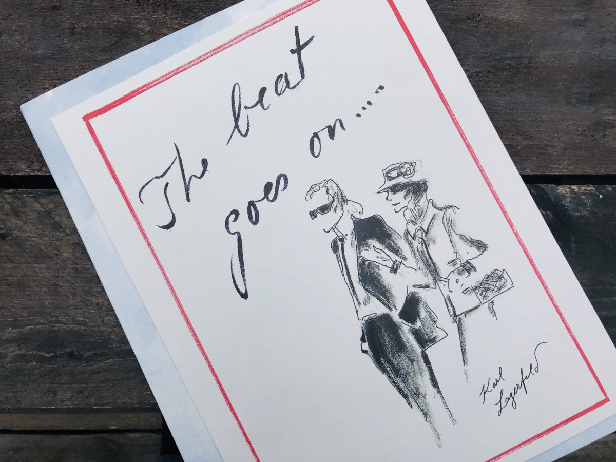 Đầu tiên phải kể đến bản phác thảo có hình minh họa của Karl và Coco Chanel do chính Lagerfeld vẽ bằng tay cùng với những từ sâu sắc: “Nhịp đập còn mãi”. Trước khi buổi diễn bắt đầu, các bản ghi âm của nhà thiết kế được phát bằng loa và mọi người đã yên lặng tưởng nhớ.