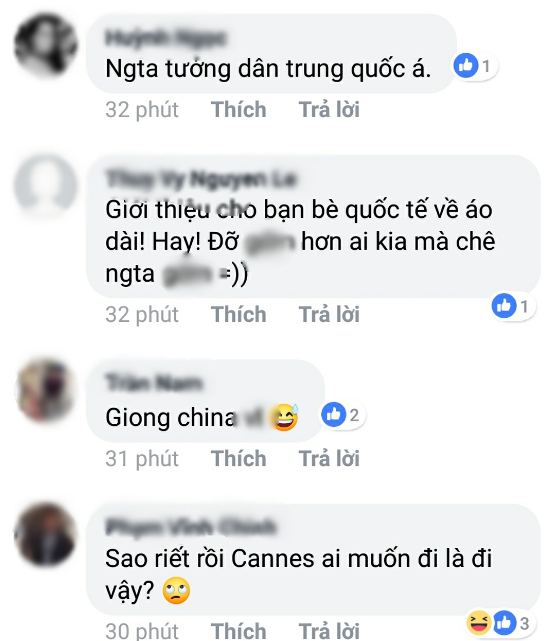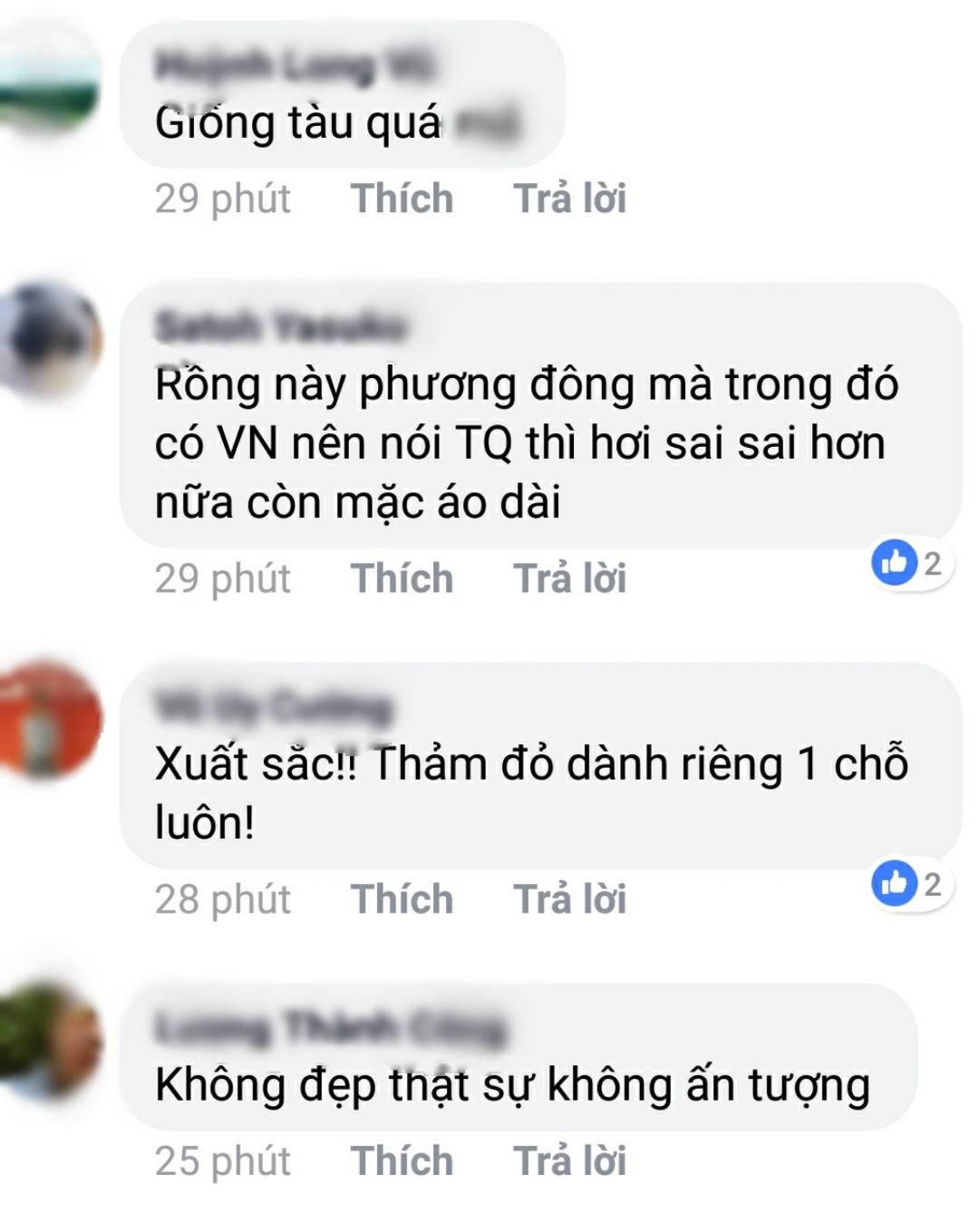 Ngay lập tức, hình ảnh của cô thu hút loạt ý kiến từ phía khán giả nước nhà. Nhưng đừng nghĩ diện áo dài là toàn được khen, không ít bình luận cho rằng trang phục màu quá đậm khiến người đẹp trở nên luống tuổi, áo choàng to nuốt hết người hay thậm chí là: “Nhìn không khác gì Trung Quốc”.