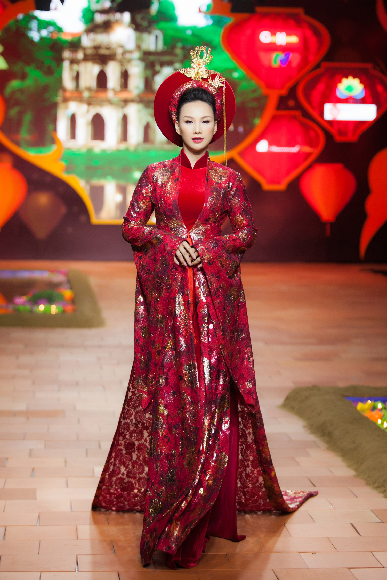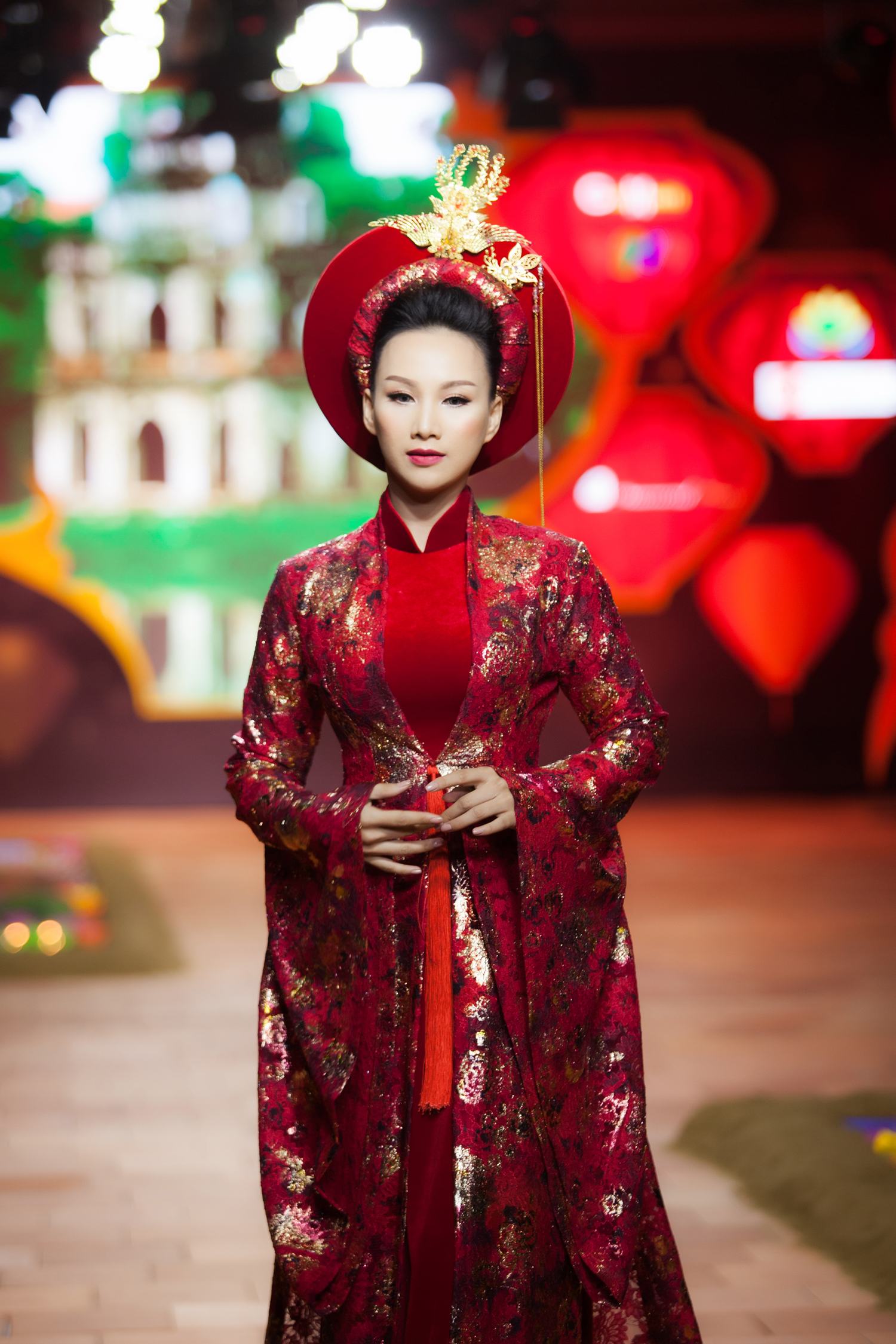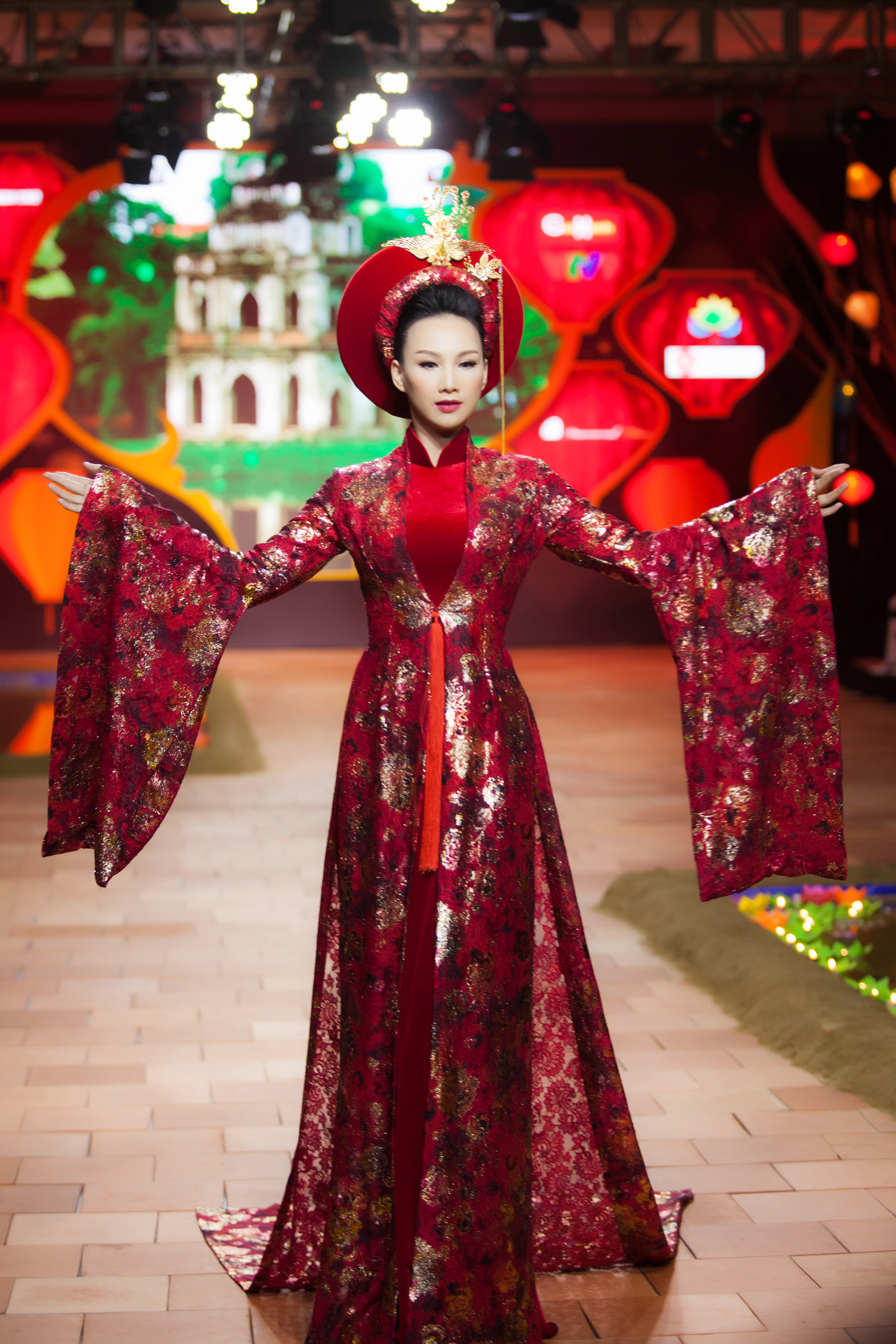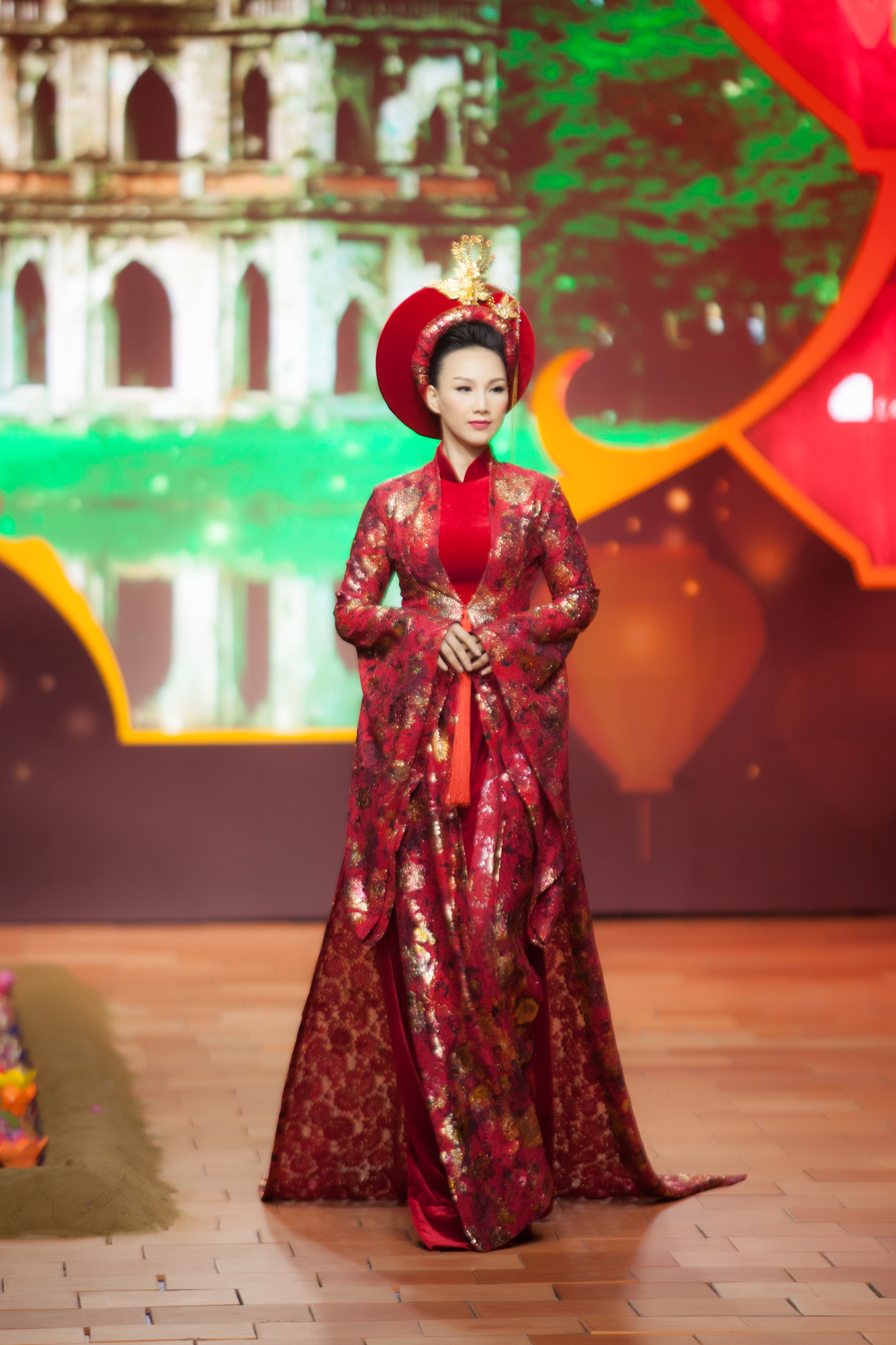 Đảm nhận vị trí vedette thể hiện thiết kế đinh nhất bộ sưu tập “Ánh trăng khai sáng”, hoa hậu Paris Vũ sải bước chuyên nghiệp trên đường băng. Người đẹp nổi bật trên sàn diễn với thiết kế tông đỏ “toàn tập”.