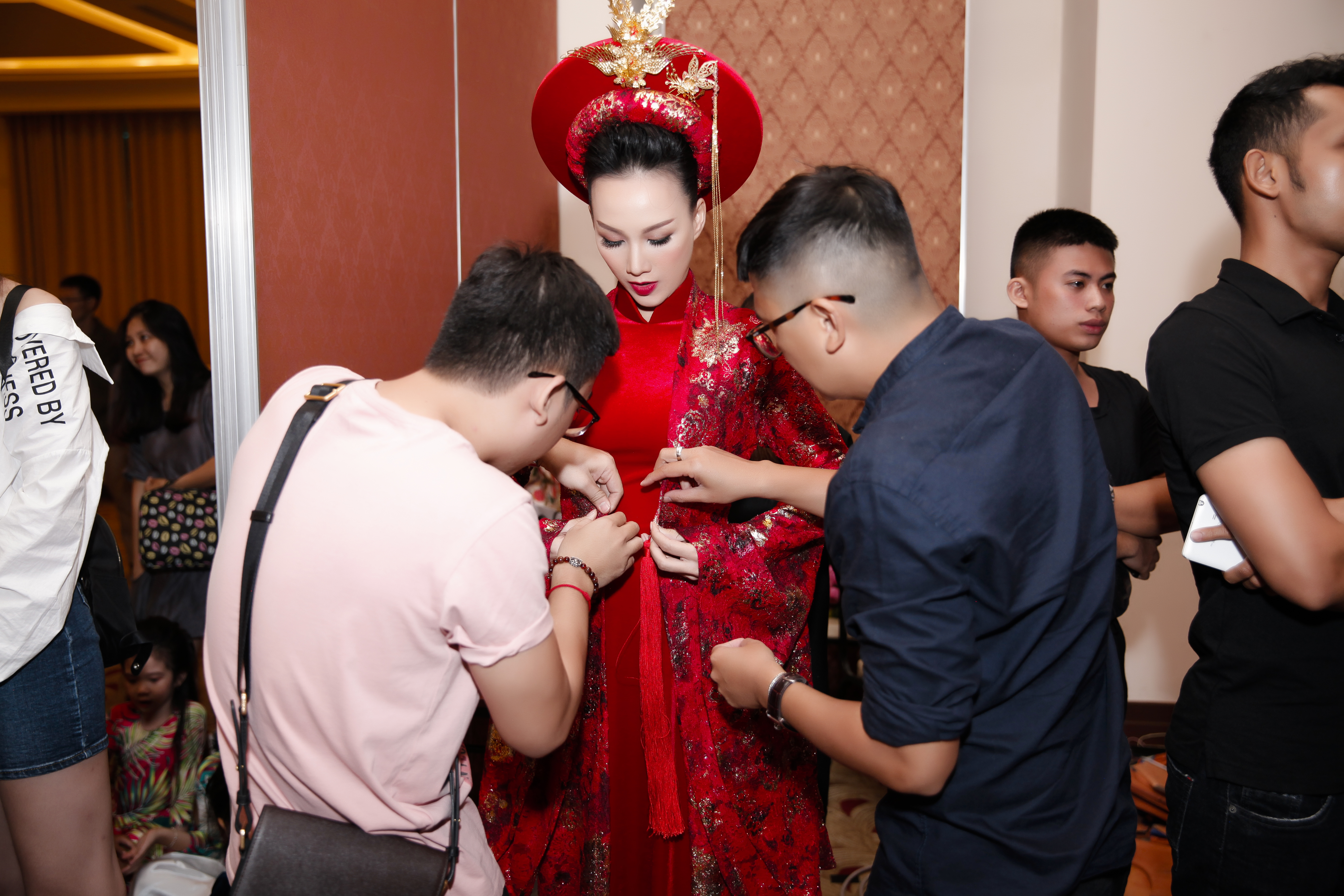 Từ áo dài, quần, mấn đều là màu đỏ tượng trưng cho ánh trăng rực rỡ nhất đêm rằm.