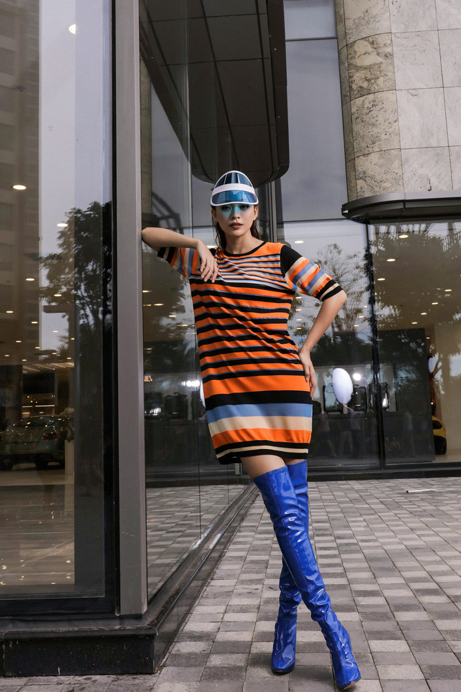 Nàng á hậu diện boots cao quá gối màu neon hot trend từng làm mưa làm gió mùa Thu - Đông 2017 phối cùng chiếc váy cam có chi tiết cùng màu. Cô nàng cũng không quên nhấn nhá bằng phụ kiện là chiếc mũ lưỡi trai chống nắng đang được giới trẻ đua nhau diện hè năm nay.