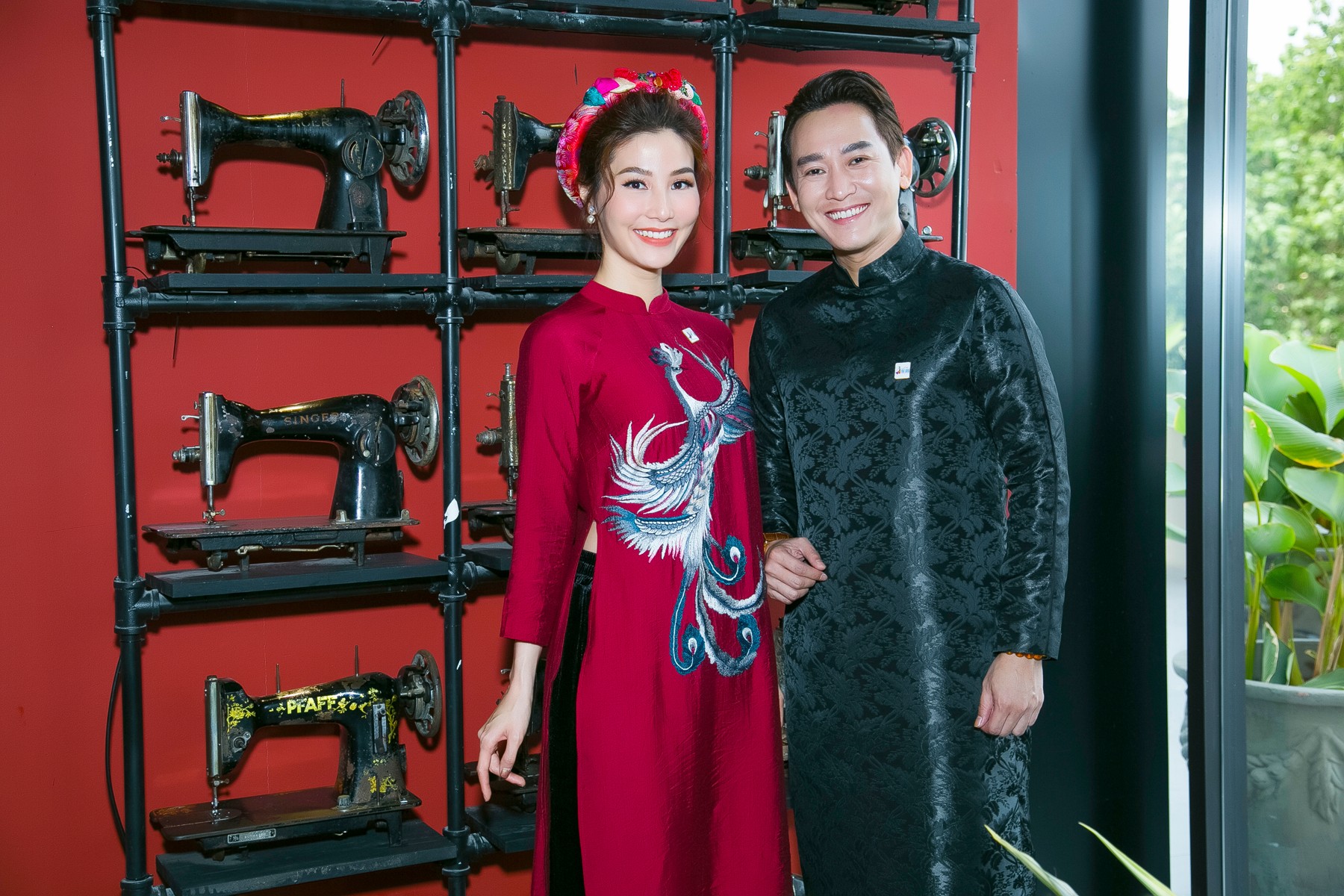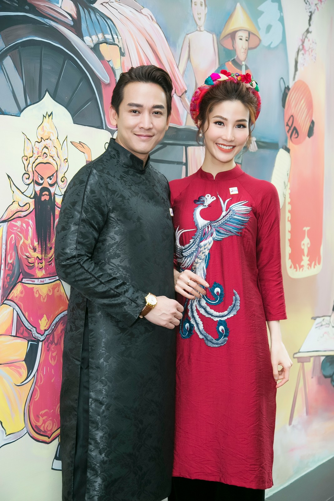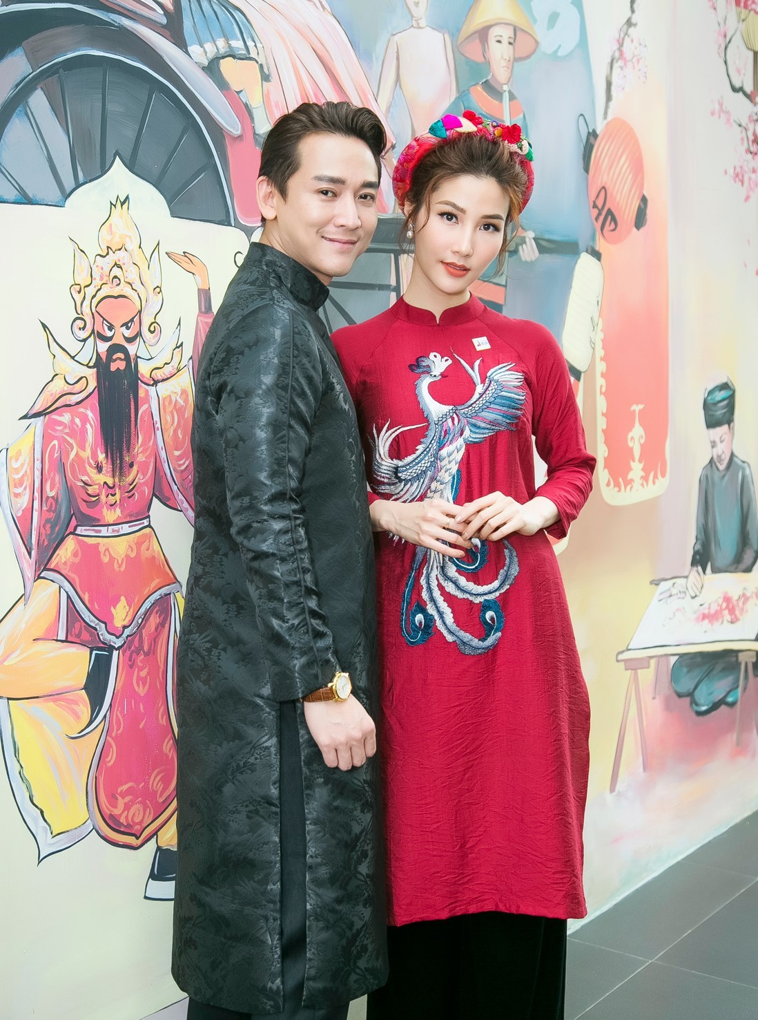 Diễm My chọn cho mình mẫu mẫu áo dài màu đỏ mận, trong khi đó “soái ca” màn ảnh Hứa Vĩ Văn chọn áo dài tông đen lịch lãm.