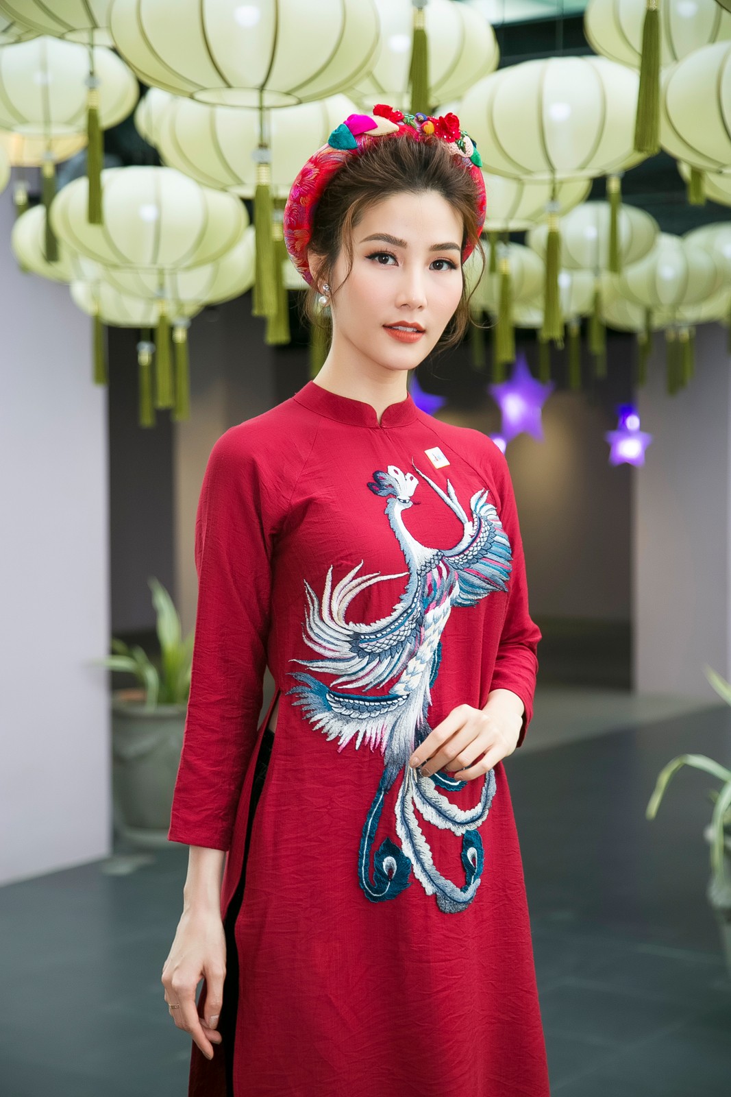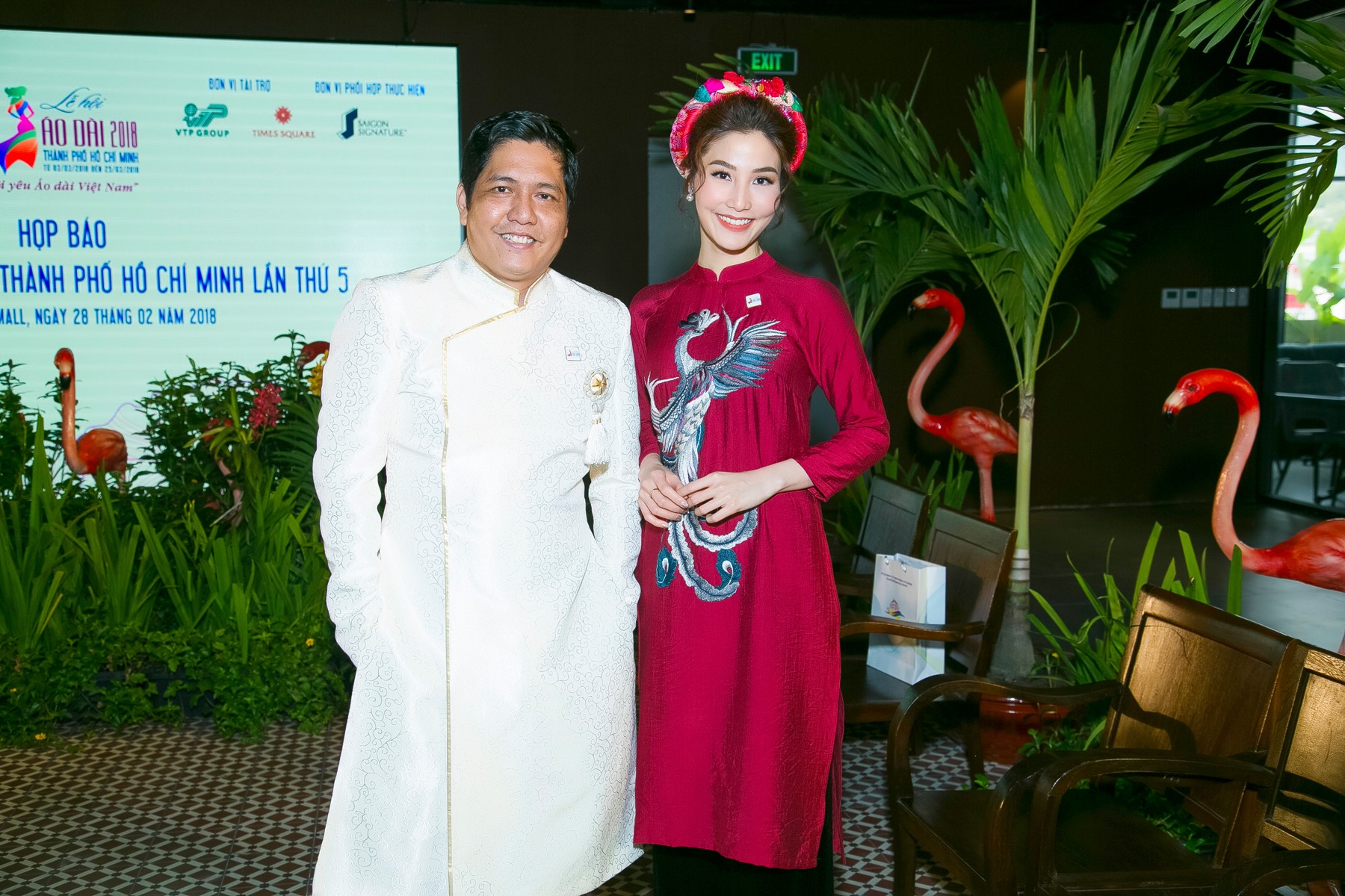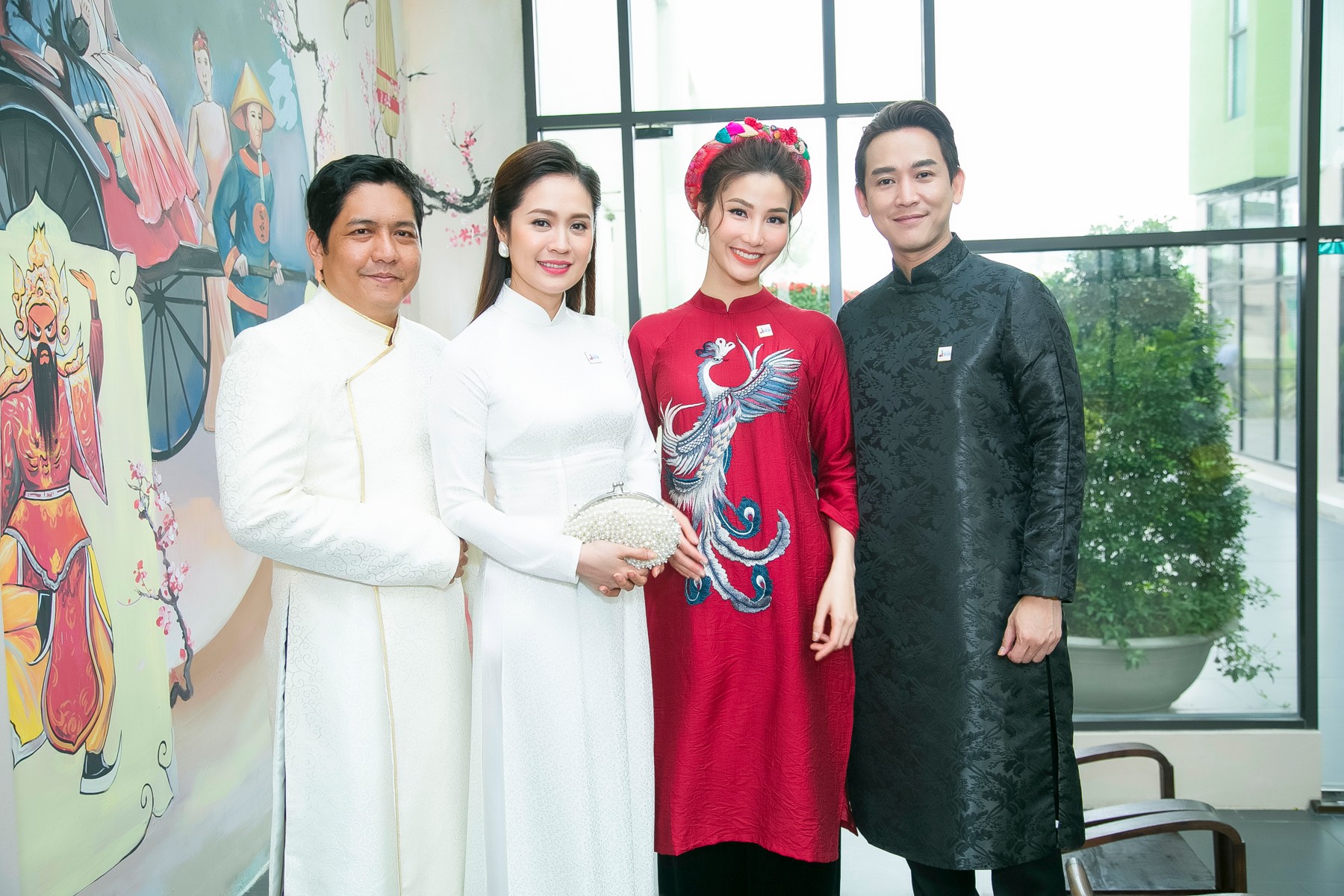 Diễm My chọn cho mình mẫu mẫu áo dài màu đỏ mận, trong khi đó “soái ca” màn ảnh Hứa Vĩ Văn chọn áo dài tông đen lịch lãm.