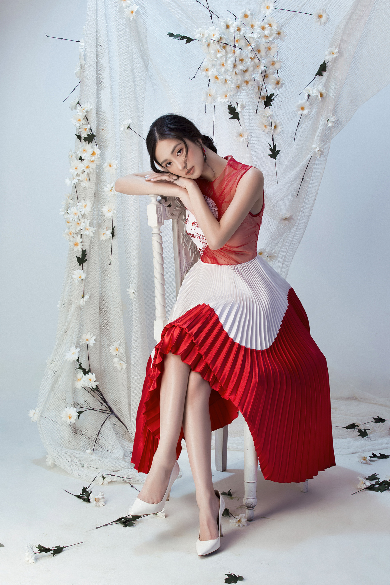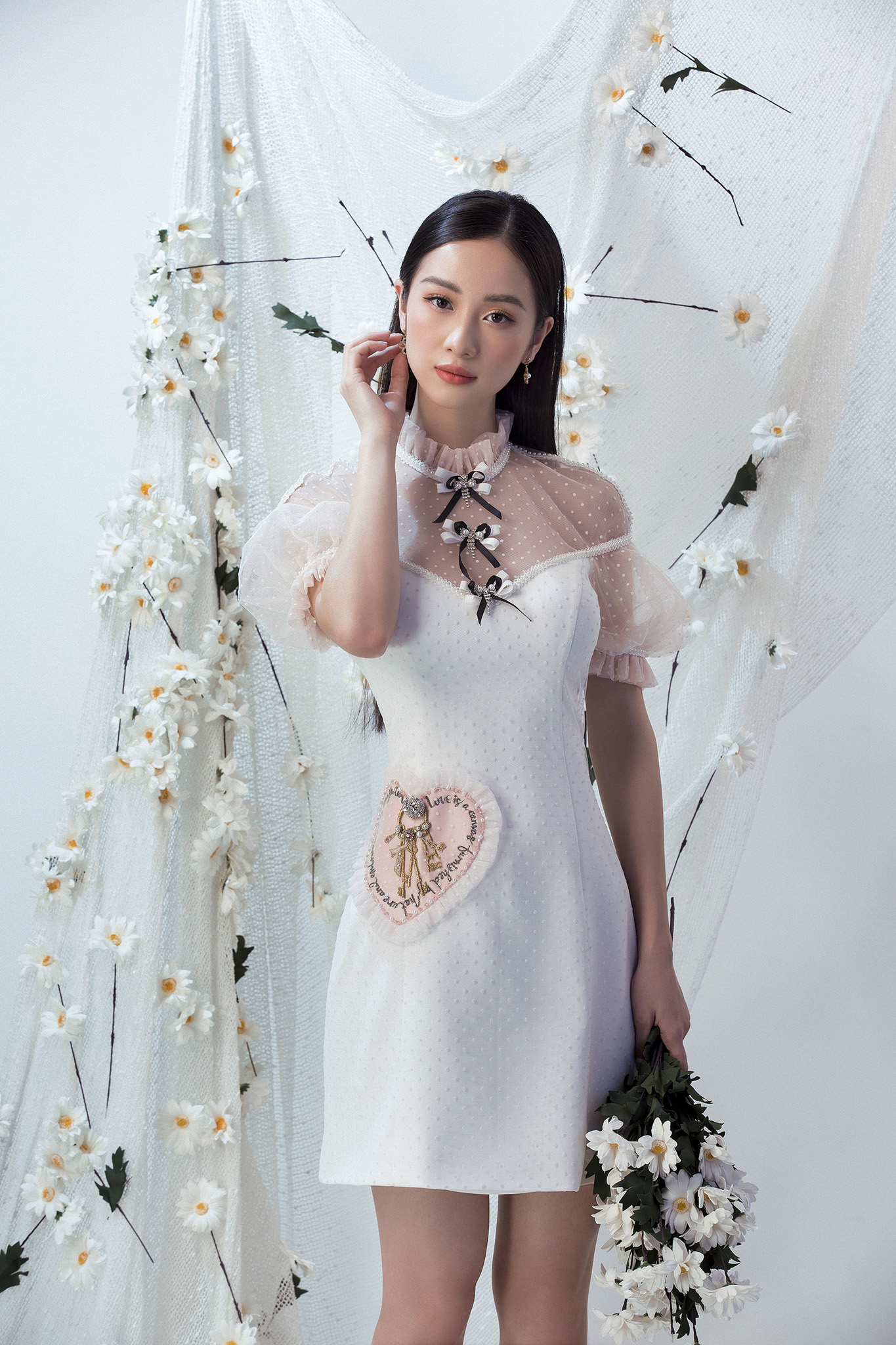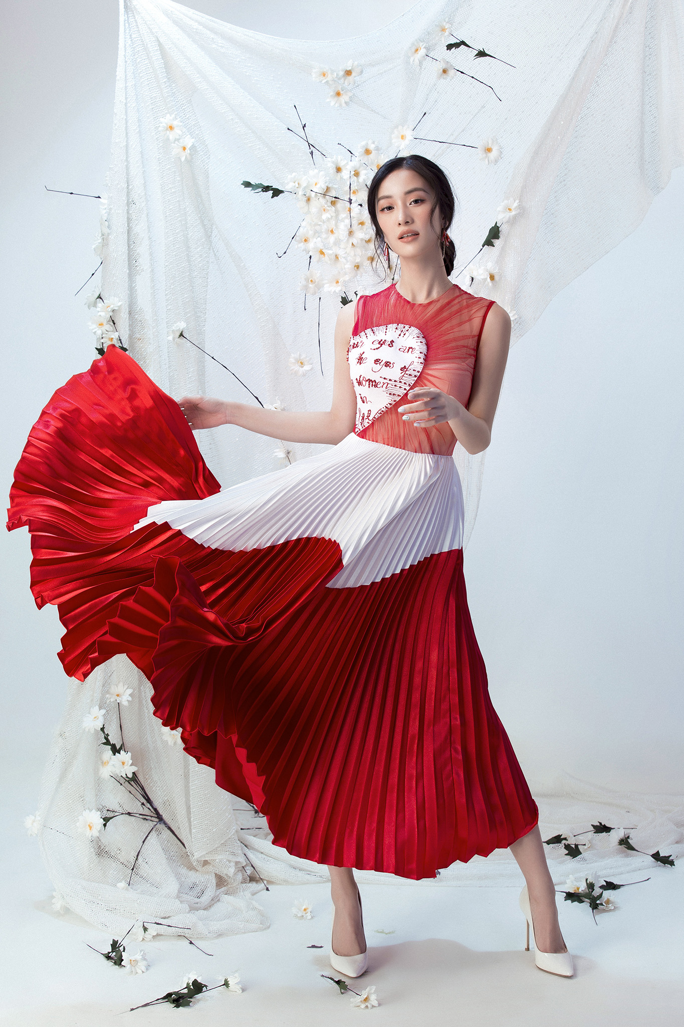 Kiểu dáng váy bất đối xứng, phần tùng wrap vừa thanh lịch nhưng cũng không kém phần sang trọng. Theo NTK Đỗ Long, anh chọn Jun Vũ vì cô sở hữu ánh mắt nhẹ nhàng, gương mặt thanh tú cùng dáng điệu rất phù hợp để hoá thân thành nàng xuân bước ra từ xứ mộng cảnh.
