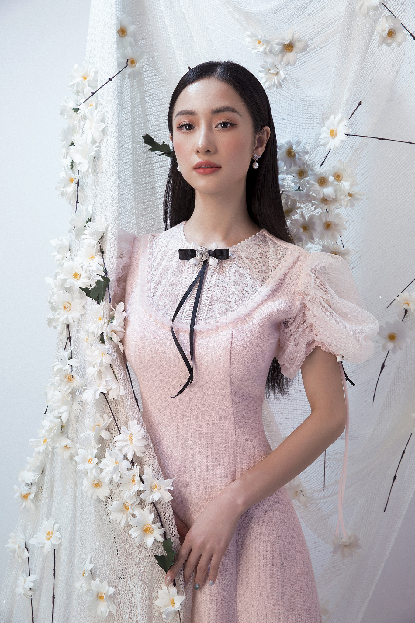 Các thiết kế mà cô nàng lựa chọn có tông màu pastel nhẹ nhàng, dễ dàng phù hợp với nhiều sắc da. Chất liệu sử dụng cũng là voan, ren e ấp kết hợp cùng các chất liệu như bố, kaki…