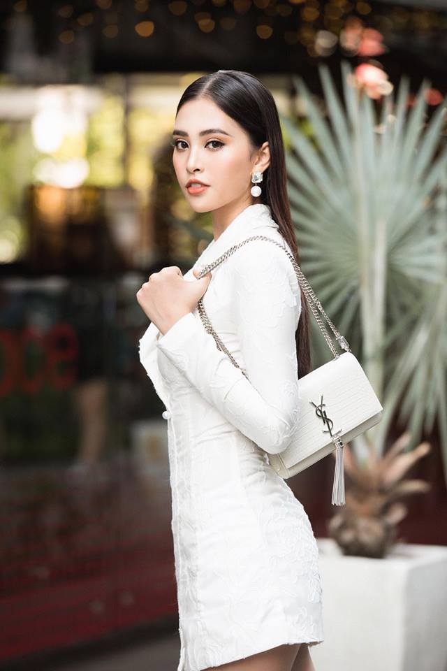 Với nhan sắc cùng vóc dáng của mình, Tiểu Vy hoàn toàn có thể cân được nhiều thể loại trang phục khác nhau. Cách đó ít ngày, cô nàng cũng vừa thả dáng trong mẫu đầm vest trắng tinh tế của NTK Nguyễn Tiến Truyển, tay xách túi YSL thời thượng.