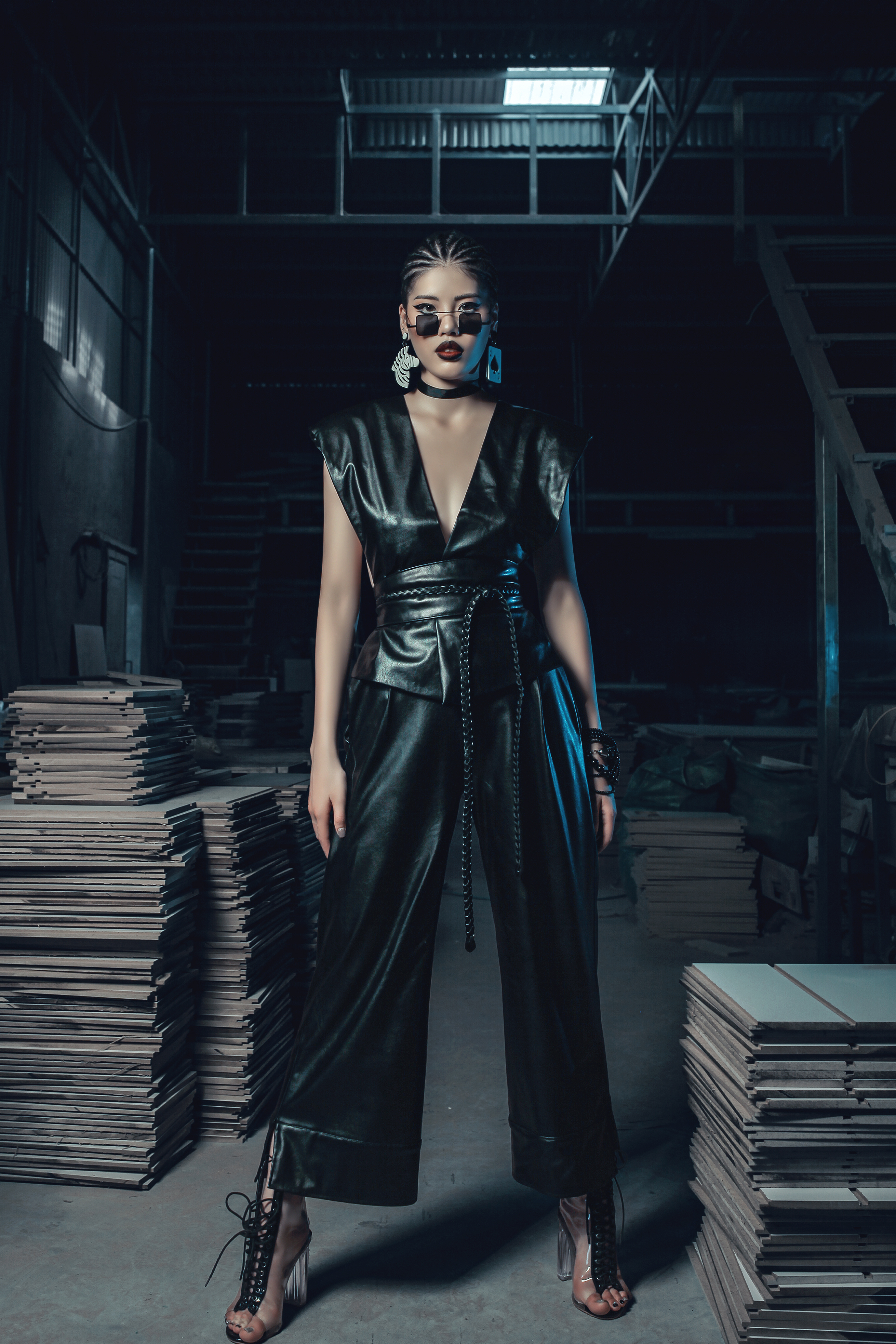 Chất liệu da bóng tưởng chừng không mấy thời thượng, nhưng với áo xẻ sâu phom cứng cùng quần culottes đã tạo nên set đồ ấn tượng.