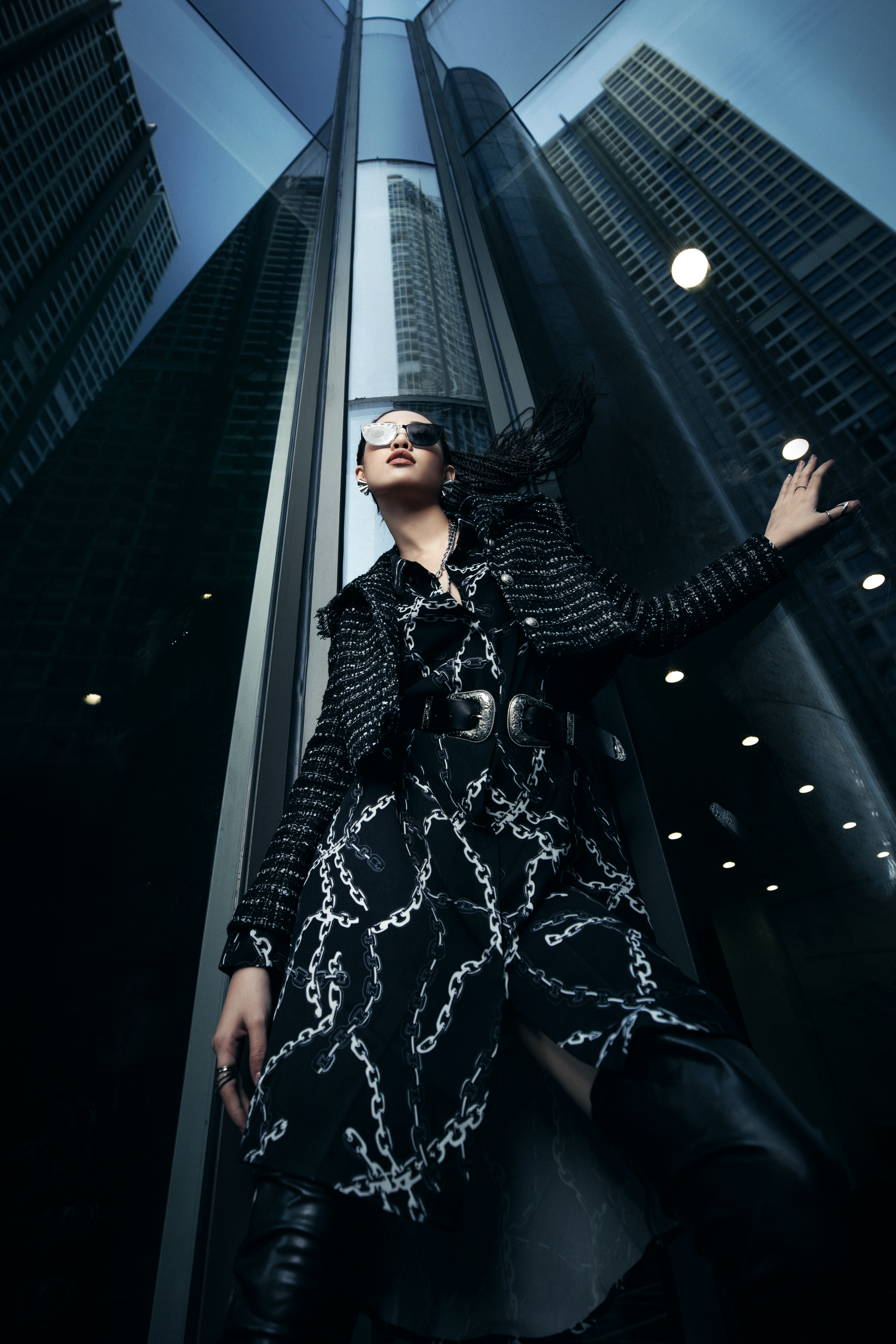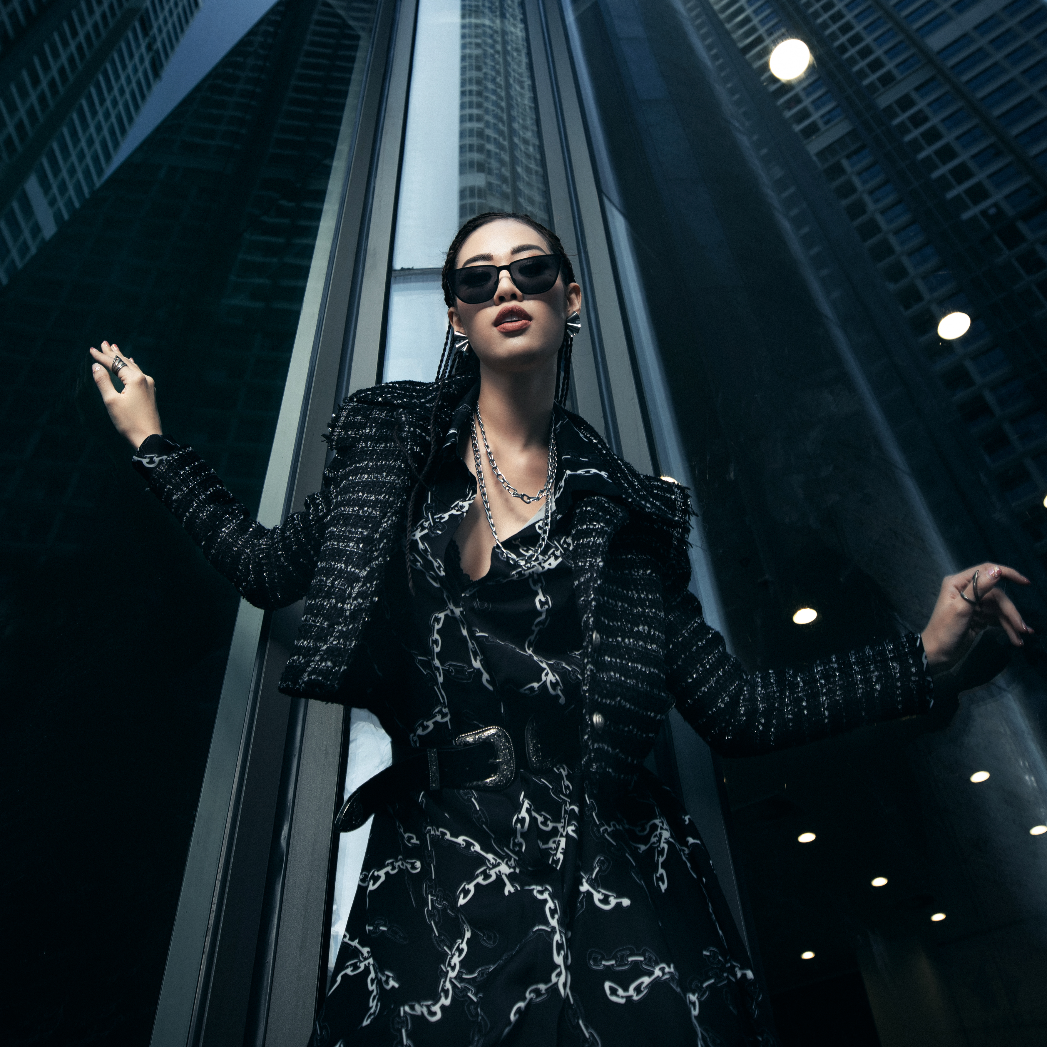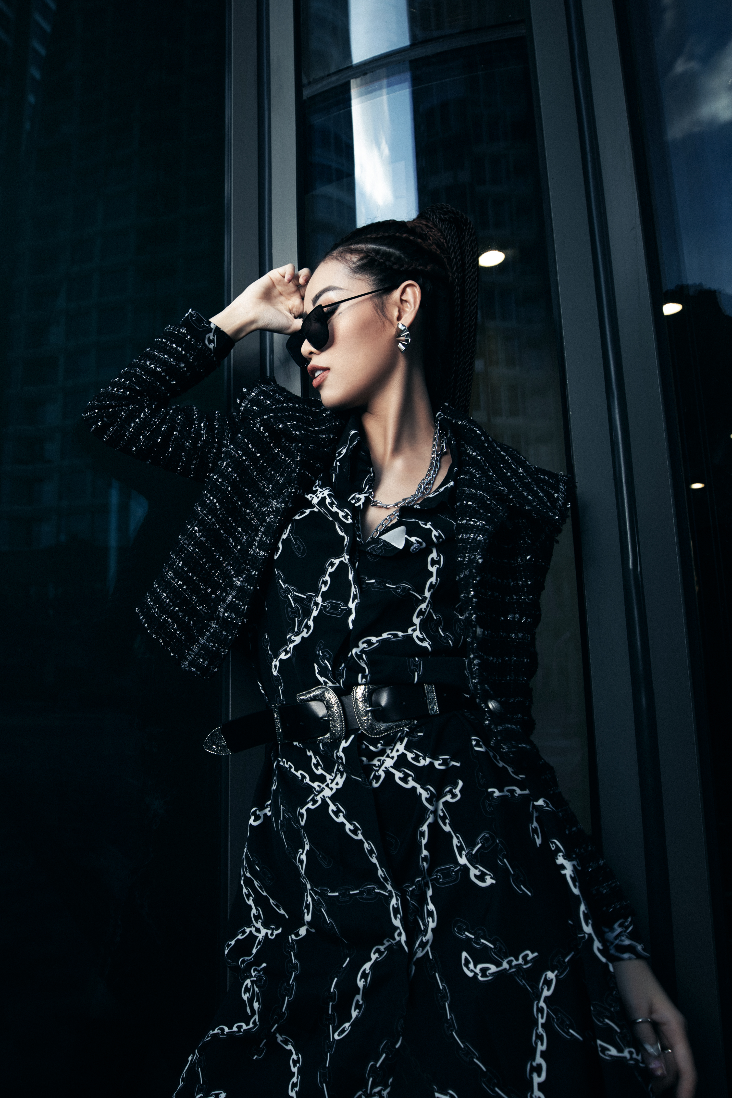 Diện chiếc áo tông đen có họa tiết dây xích, Khánh Vân mix cùng áo khoác và mắt kính đen chất ngầu.