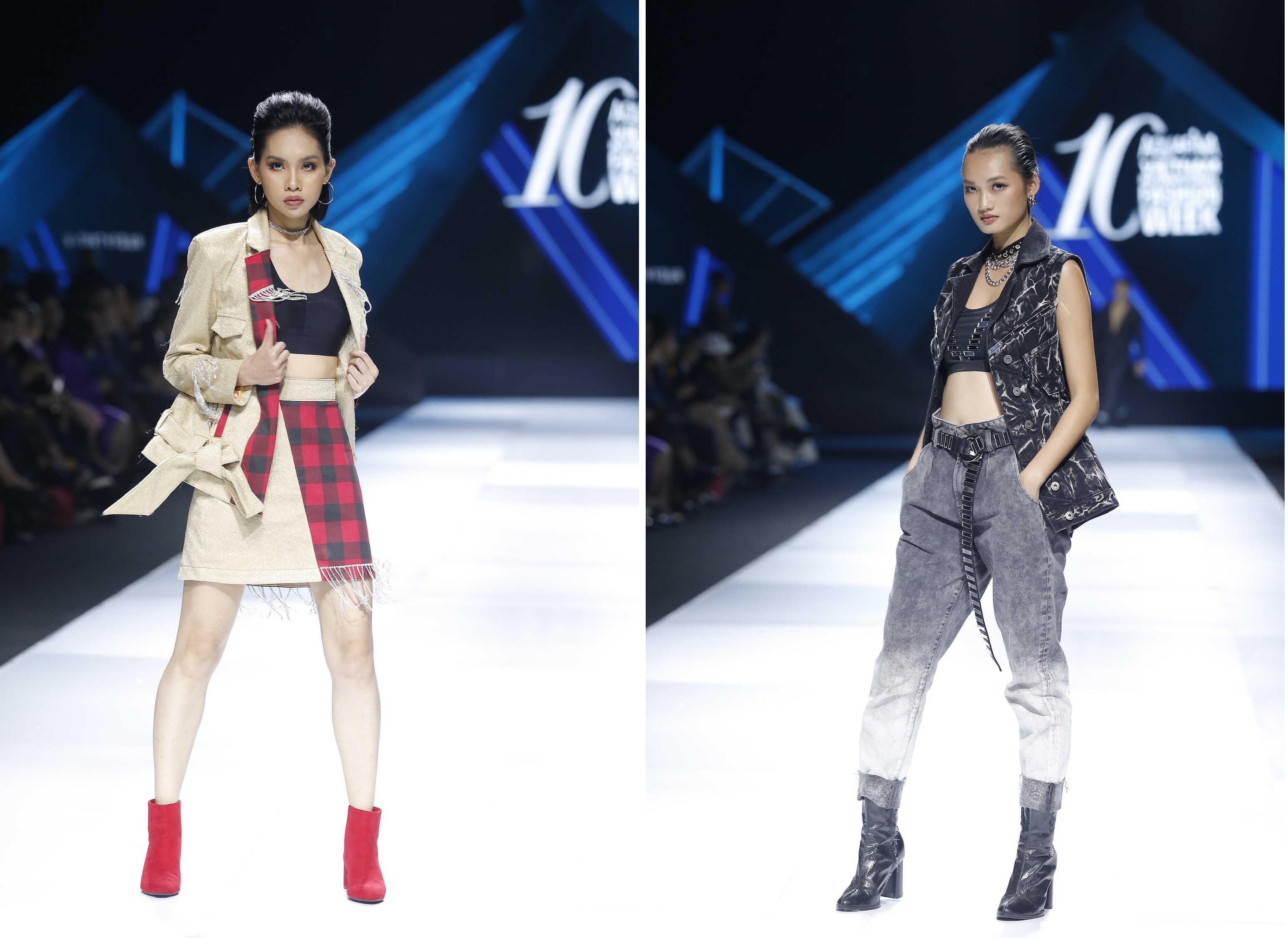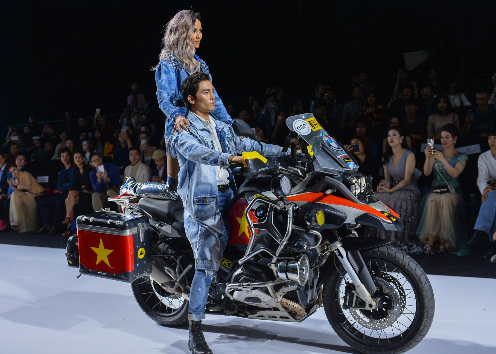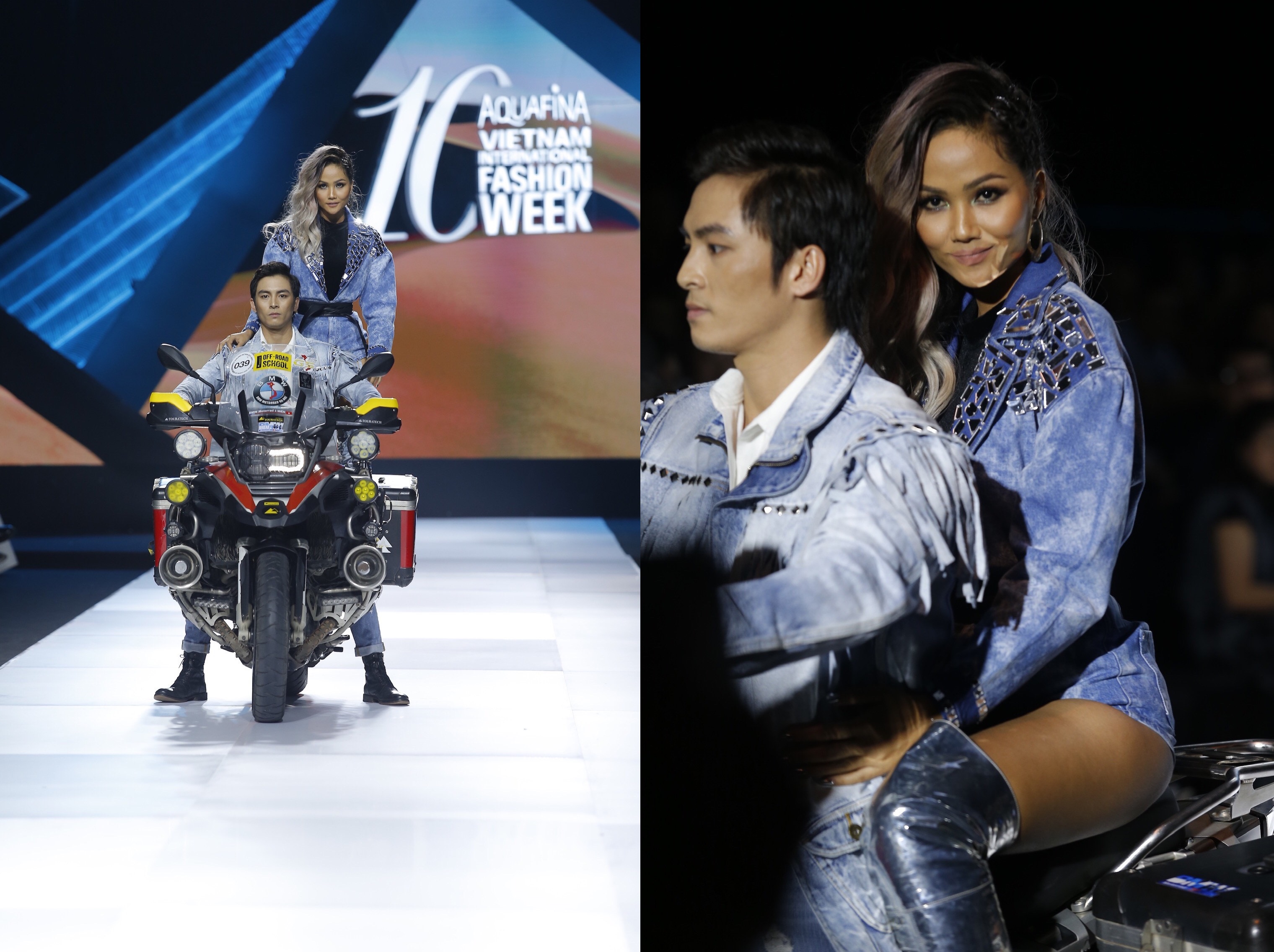 Nam diễn viên điển trai Lãnh Thanh cùng hoa hậu H'Hen Niê “cool ngầu” khi mặc đồ jeans, cưỡi môtô. Cách xuất hiện độc đáo này khiến cho các thiết kế nổi bật hơn, hâm nóng bầu không khí trong hội trường.