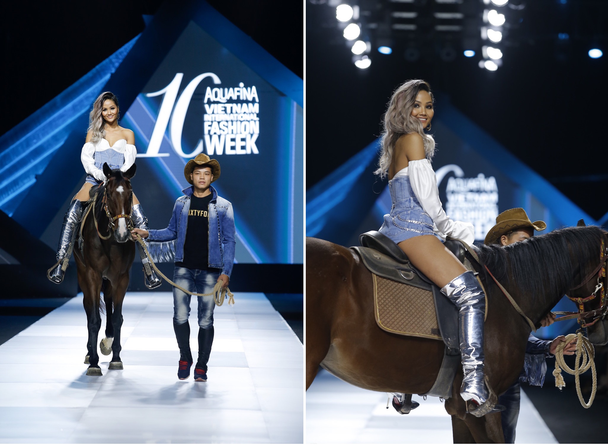 Hết môtô, H'Hen Niê lại làm náo động khi mang cả ngựa lên sàn diễn. Lần này, nàng hoa hậu diện váy cúp ngực phối denim gợi cảm. Bên cạnh đó, đôi boots cao cổ màu bạc nổi bật góp phần làm cho set đồ thêm phần cá tính, thời thượng.