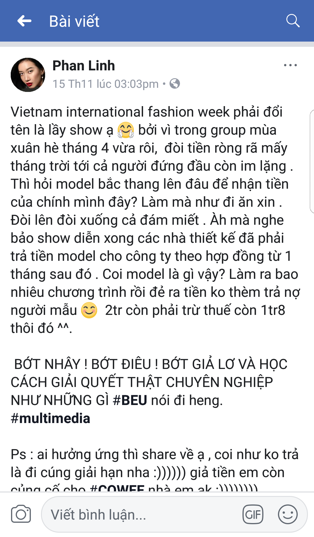 Phan Linh còn cho biết thêm: “Làm mà như đi ăn xin. Đòi lên đòi xuống cả đám miết. Tôi còn nghe nói, show diễn xong các nhà thiết kế đã phải trả tiền người mẫu cho công ty theo hợp đồng từ một tháng sau đó. BTC Coi người mẫu là gì vậy? Làm ra bao nhiêu chương trình đẻ ra tiền rồi không thèm trả nợ người mẫu”.