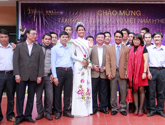 Đội vương miện hoa hậu danh giá, H'Hen Niê chỉ phối cùng phụ kiện hoa tai ngọc trai đã vô cùng rạng rỡ. Cô không ngần ngại giao lưu và dành tặng thầy cô cũng như các em học sinh tại trường cũ tiết mục văn nghệ vui tươi.