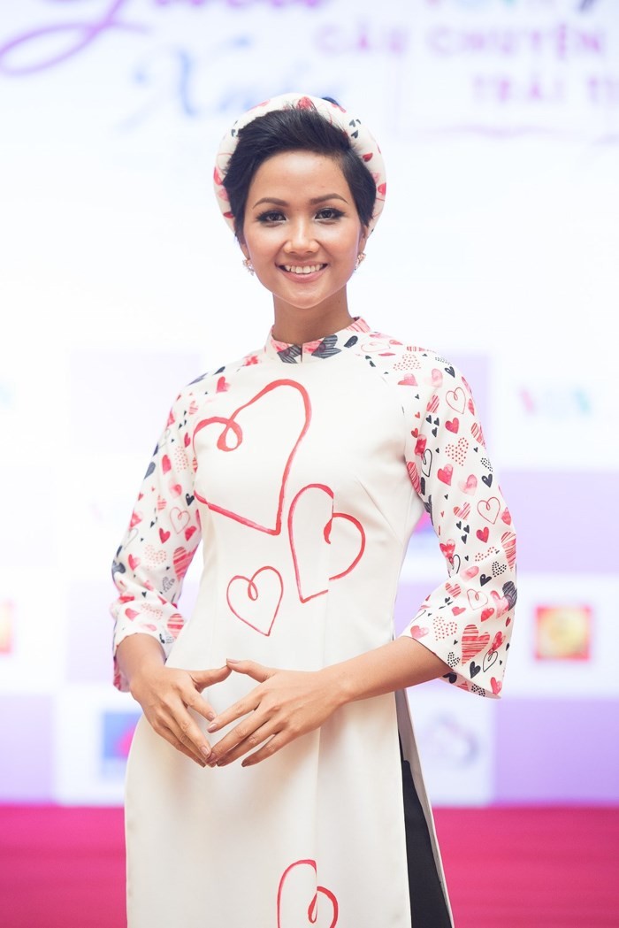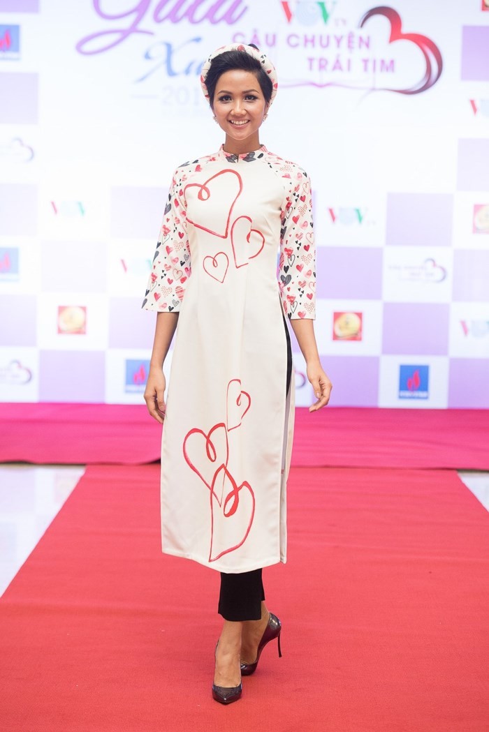 Chiếc áo dài mà H’Hen Niê mặc do chính tay Hoa hậu Ngọc Hân thiết kế. Khác với vẻ cá tính thường thấy, H’Hen Niê trông thật nhẹ nhàng, thướt tha. Được biết, cô tham gia chương trình Gala Xuân 2018 - Câu chuyện trái tim với tư cách một Đại sứ của chương trình.